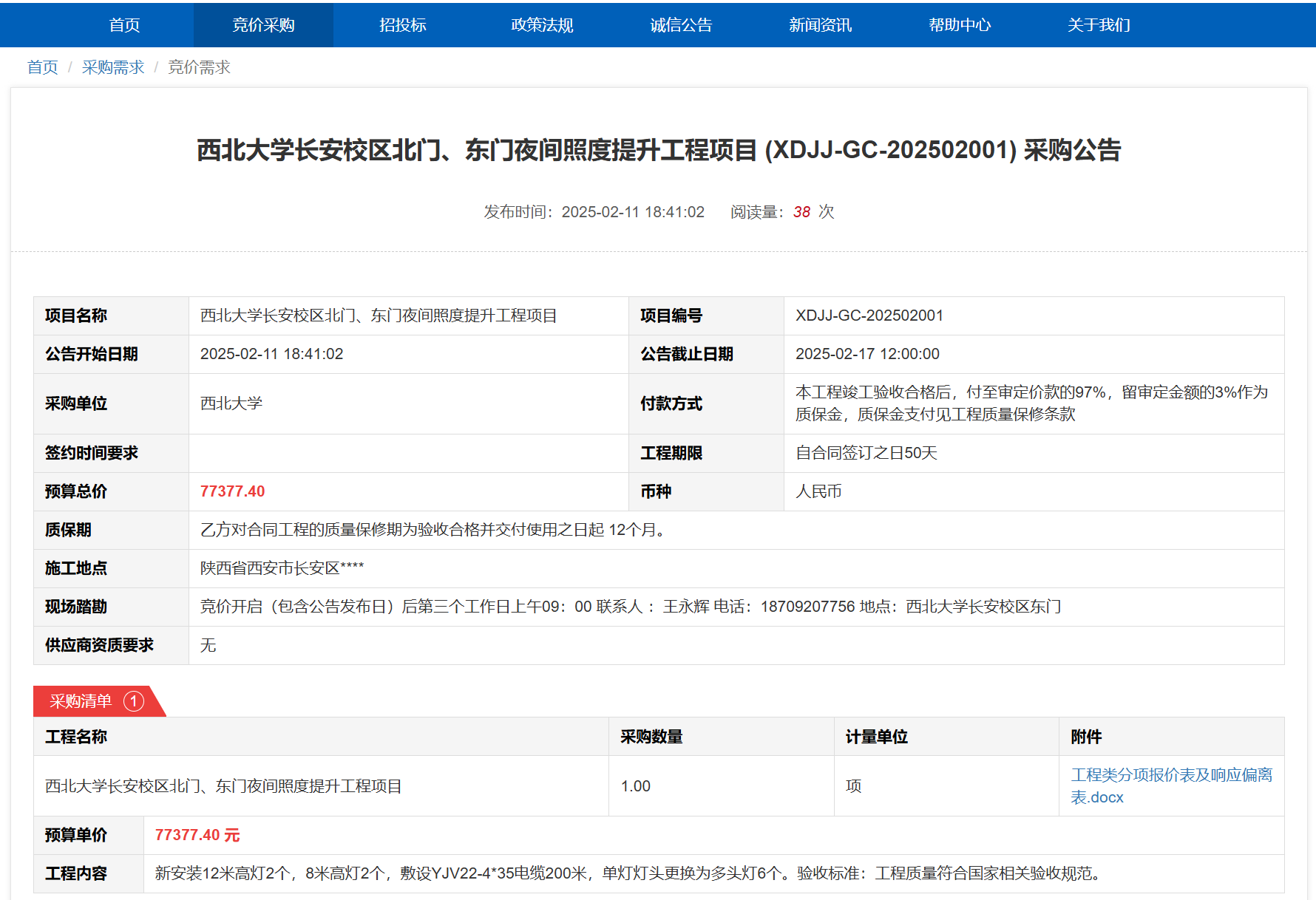 乐投平台长安校区北门、东门夜间照度提升工程项目(XDJJ-GC-202502001)竞价采购公告 作者:采购与招标办公室 编辑: 时间:2025-02-11 原公告链接:https://www.ejingcai.com.cn/site/bidding/detail/16497