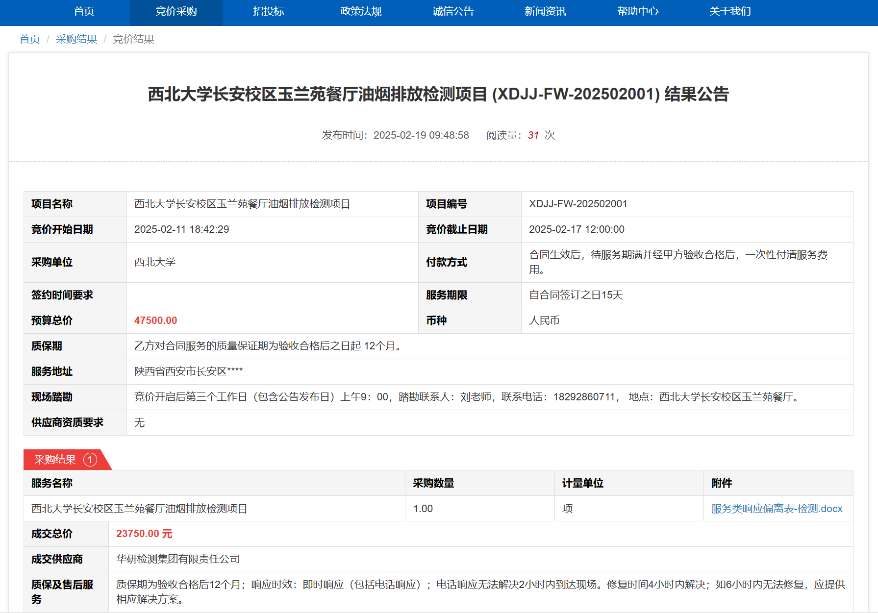 乐投平台长安校区玉兰苑餐厅油烟排放检测项目(XDJJ-FW-202502001)竞价结果公告 作者:采购与招标办公室 编辑: 时间:2025-02-19 原公告链接:https://www.ejingcai.com.cn/site/bidding/detail/16552