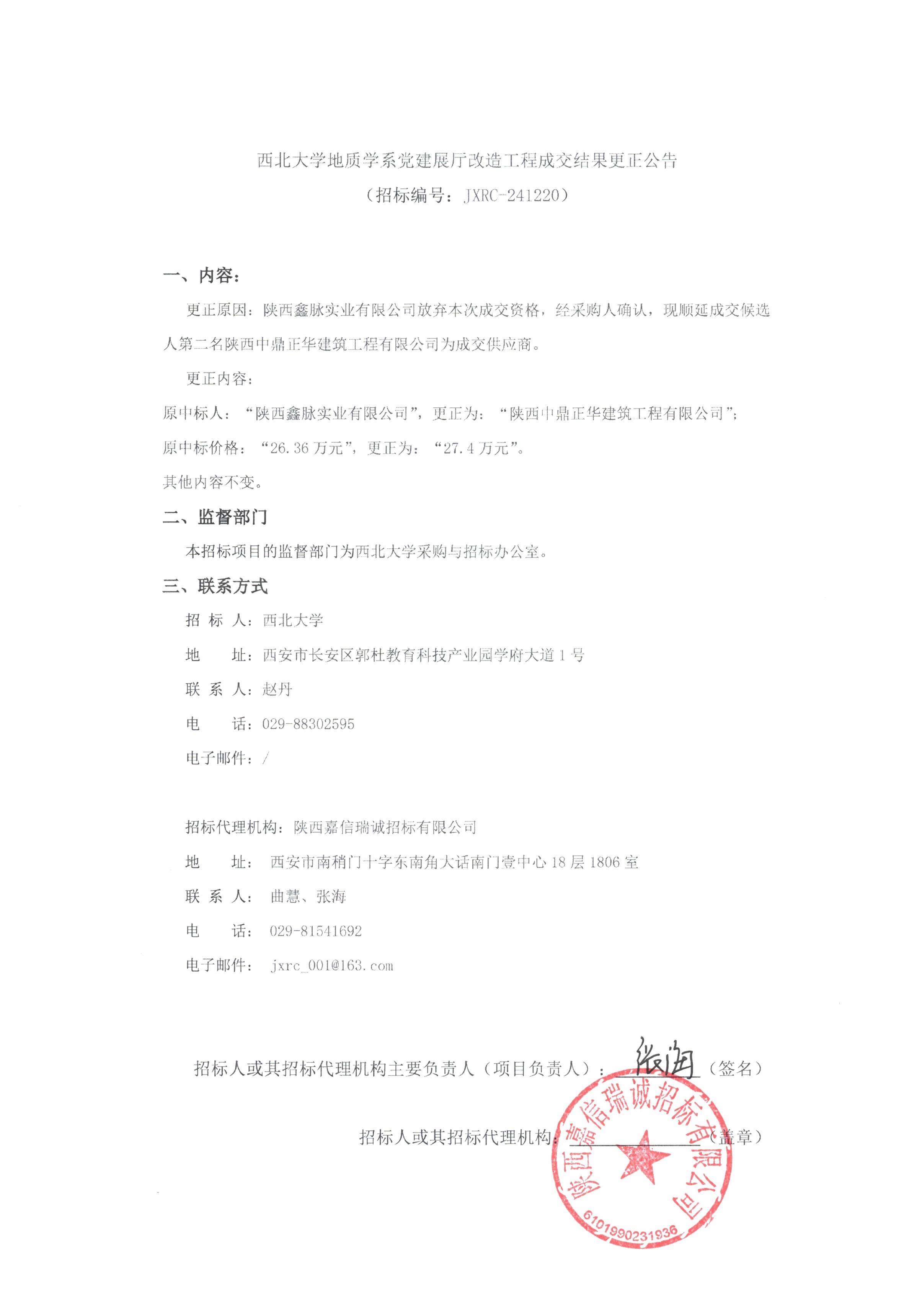 乐投平台地质学系党建展厅改造工程成交结果更正公告
