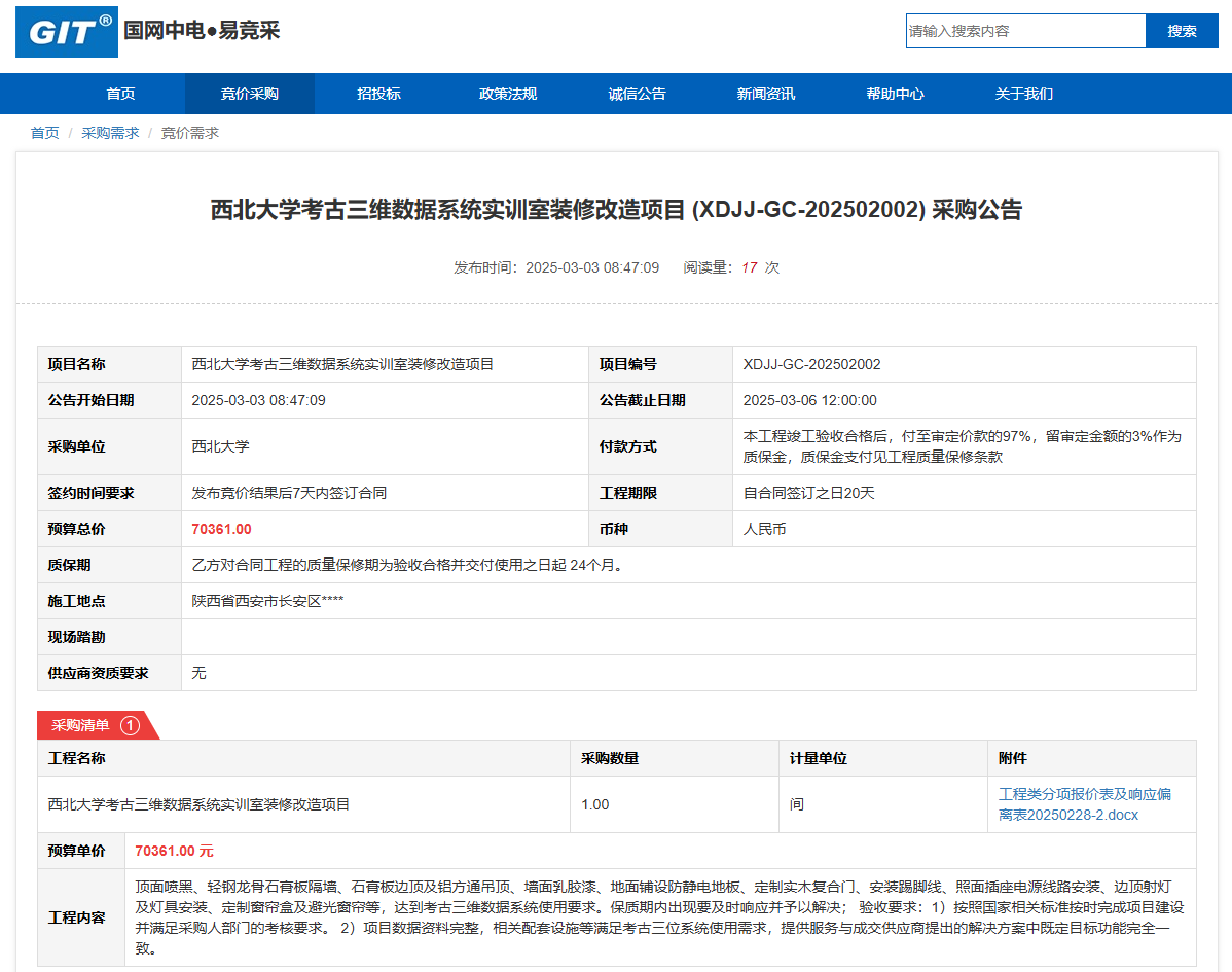 乐投平台考古三维数据系统实训室装修改造项目(XDJJ-GC-202502002)竞价采购公告 作者:采购与招标办公室 编辑: 时间:2025-03-03 原公告链接:https://www.ejingcai.com.cn/site/bidding/detail/16671