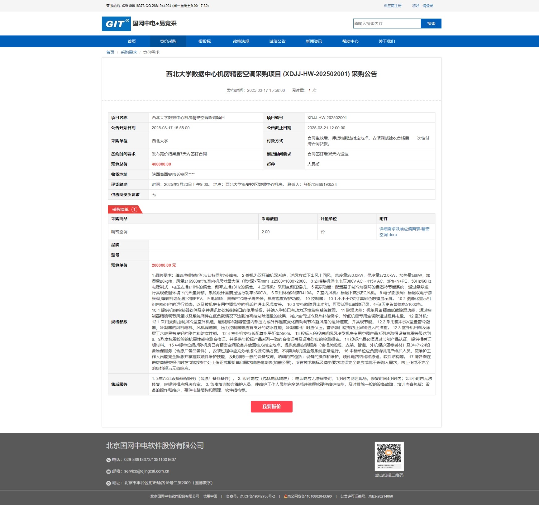 乐投平台数据中心机房精密空调采购项目 (XDJJ-HW-202502001)网上竞价采购公告 作者: 编辑:采购与招标办公室 时间:2025-03-17 原公告链接:https://www.ejingcai.com.cn/site/bidding/detail/16997