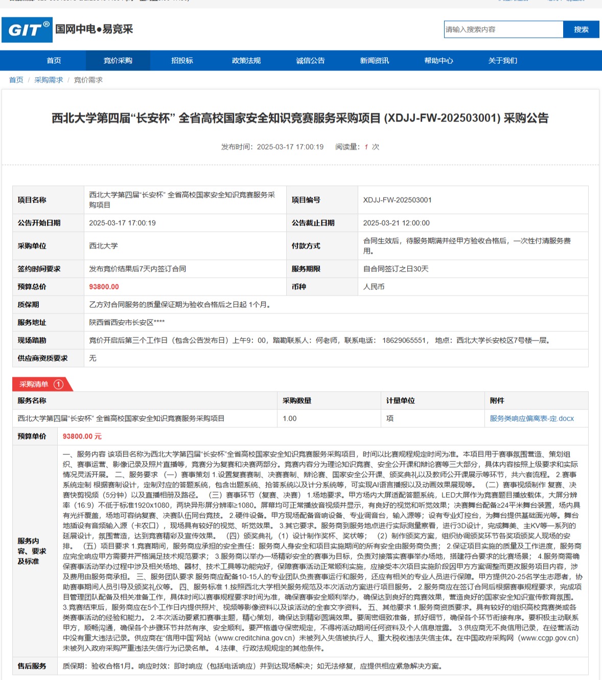乐投平台第四届“长安杯” 全省高校国家安全知识竞赛服务采购项目(XDJJ-FW-202503001)竞价采购公告 作者:采购与招标办公室 编辑: 时间:2025-03-17 原公告链接:https://www.ejingcai.com.cn/site/bidding/detail/17009