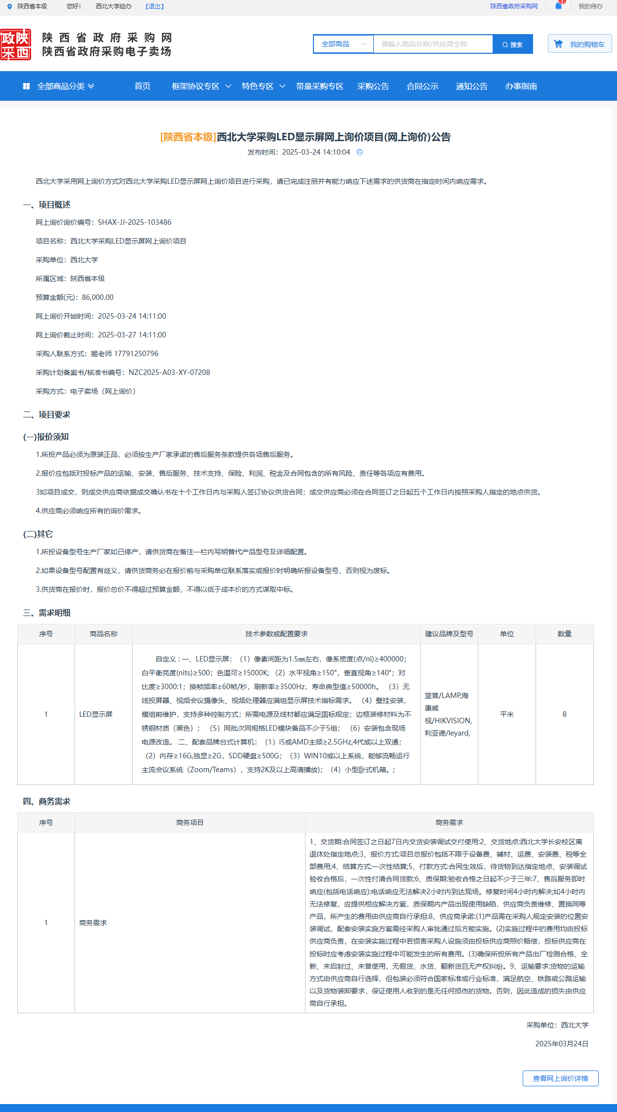 乐投平台采购LED显示屏等网上询价项目(网上询价)公告 作者:采购与招标办公室 编辑: 时间:2025-03-24 原公告链接:https://www.ccgp-shaanxi.gov.cn/gpmall-main-web/basic/noticeDetail?noticeGuid=7303200839336919040