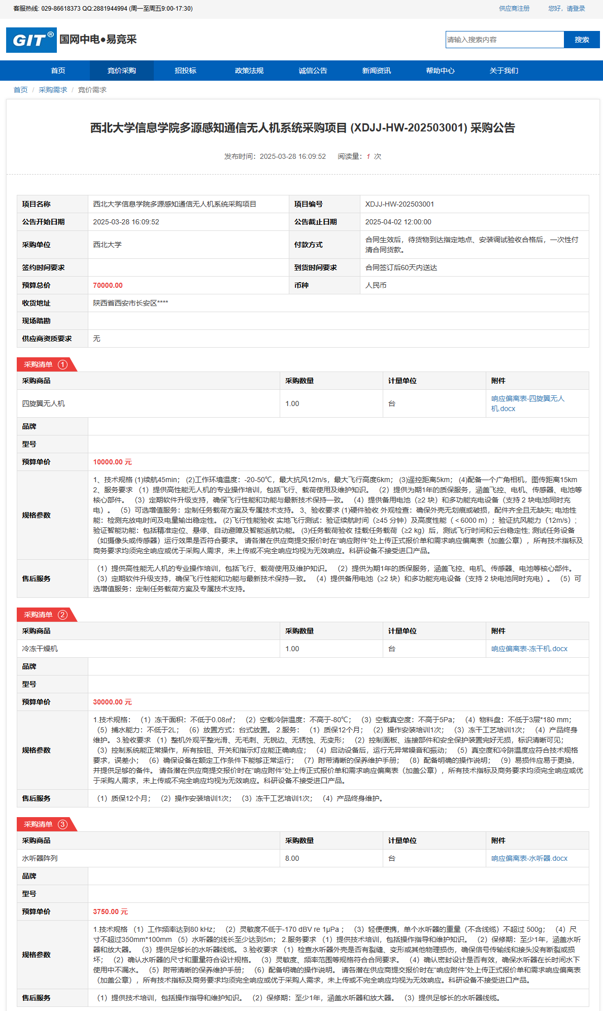 乐投平台信息学院多源感知通信无人机系统采购项目(XDJJ-HW-202503001)竞价采购公告 作者:采购与招标办公室 编辑: 时间:2025-03-28 原公告链接:https://www.ejingcai.com.cn/site/bidding/detail/17255