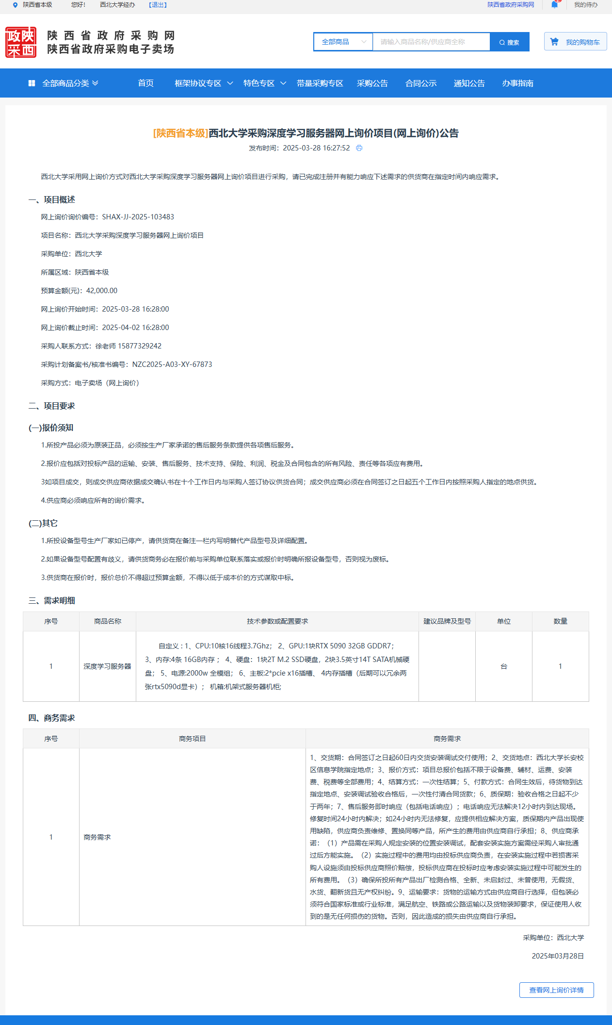 乐投平台采购深度学习服务器网上询价项目(网上询价)公告 作者:采购与招标办公室 编辑: 时间:2025-03-28 原公告链接:https://www.ccgp-shaanxi.gov.cn/gpmall-main-web/basic/noticeDetail?noticeGuid=7304685071385165824