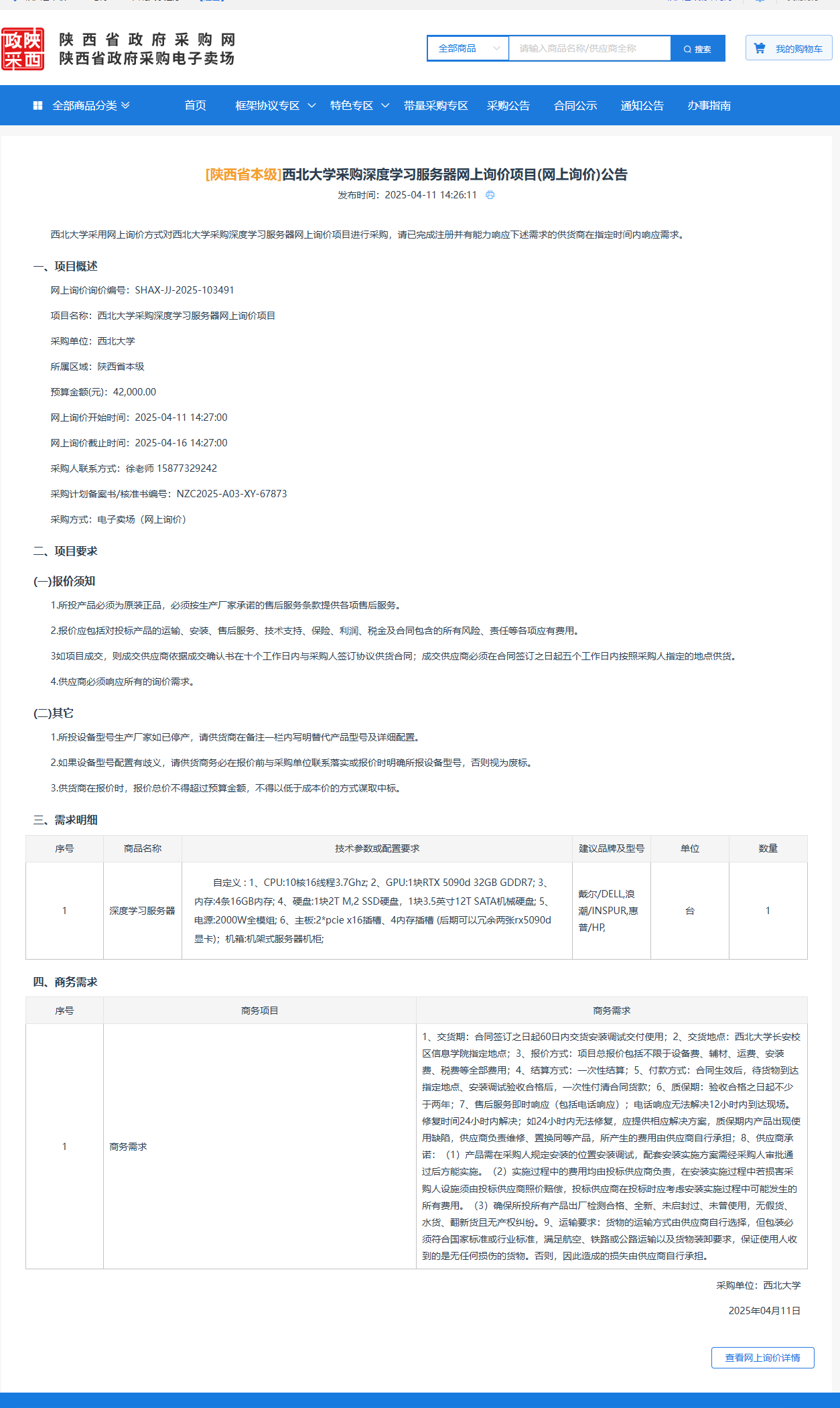 乐投平台采购深度学习服务器网上询价项目(网上询价)公告 作者:采购与招标办公室 编辑: 时间:2025-04-11 原公告链接:https://www.ccgp-shaanxi.gov.cn/gpmall-main-web/basic/noticeDetail?noticeGuid=7309727879137525760