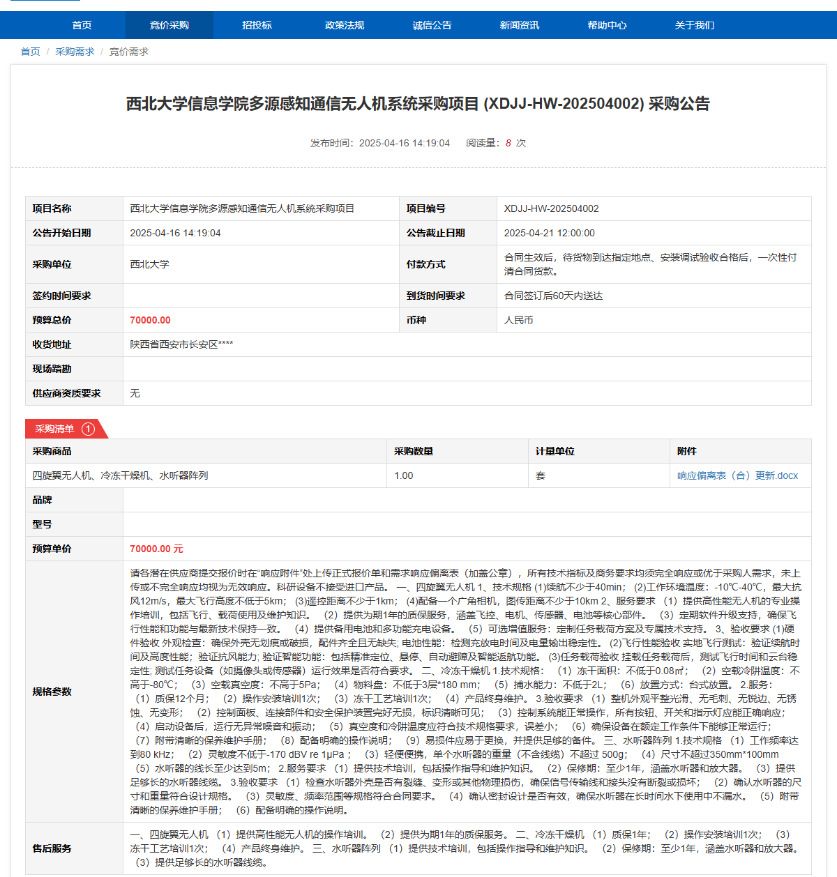 乐投平台信息学院多源感知通信无人机系统采购项目(XDJJ-HW-202504002)竞价采购公告 作者:采购与招标办公室 编辑: 时间:2025-04-16 原公告链接:https://www.ejingcai.com.cn/site/bidding/detail/17703