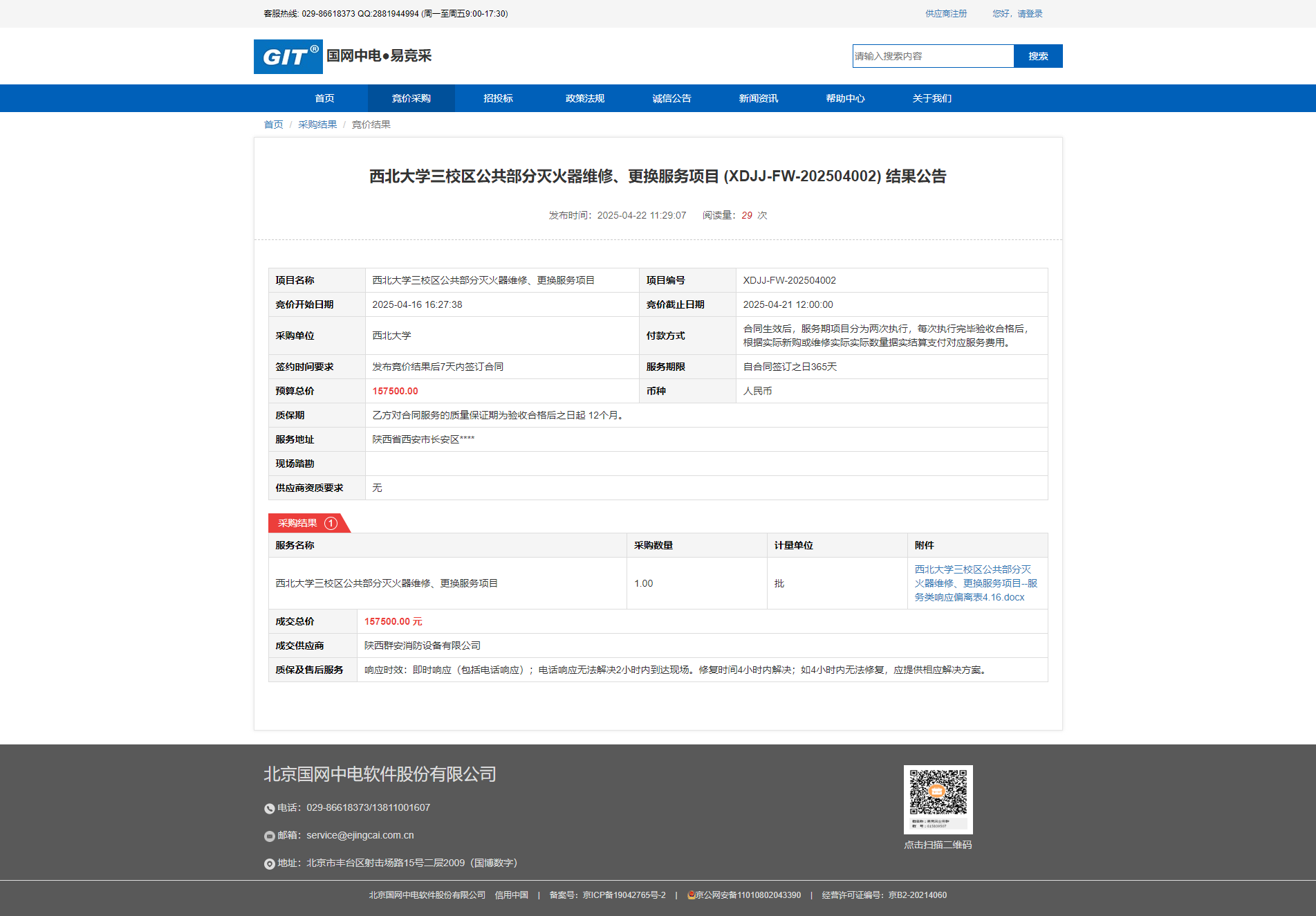 乐投平台三校区公共部分灭火器维修、更换服务项目 (XDJJ-FW-202504002) 结果公告