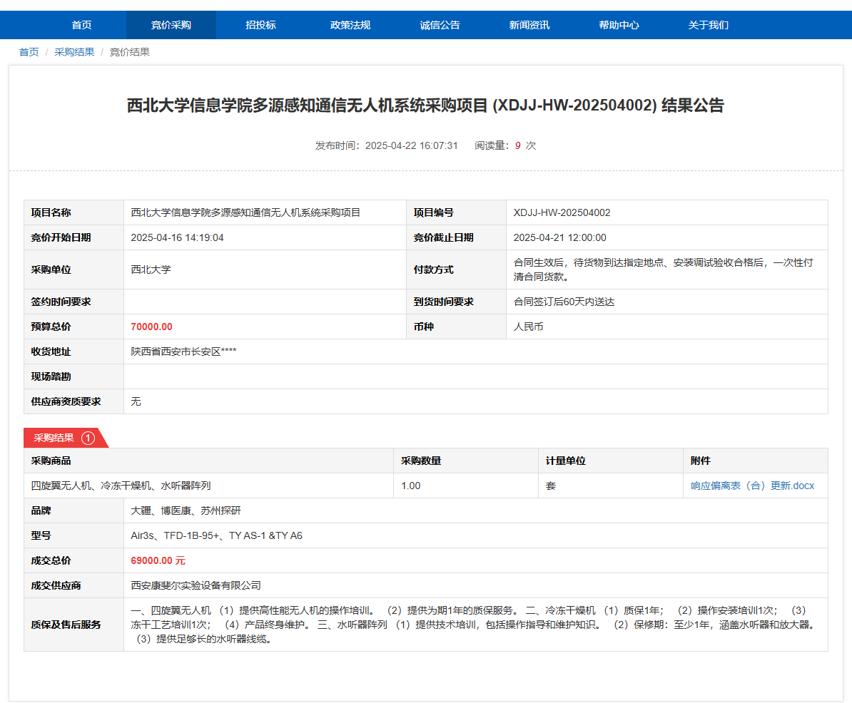 乐投平台信息学院多源感知通信无人机系统采购项目 (XDJJ-HW-202504002) 结果公告 作者:采购与招标办公室 编辑: 时间:2025-04-22 原公告链接:https://www.ejingcai.com.cn/site/bidding/detail/17844