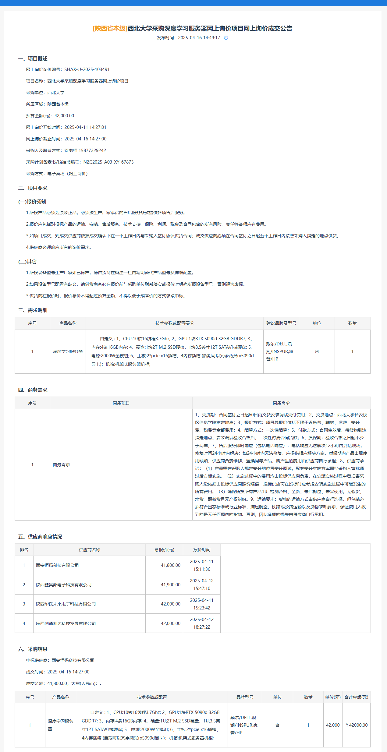 乐投平台采购深度学习服务器网上询价项目网上询价成交公告 作者:采购与招标办公室 编辑: 时间:2025-04-23 原公告链接:https://www.ccgp-shaanxi.gov.cn/gpmall-main-web/basic/noticeDetail?noticeGuid=7311545629157818368