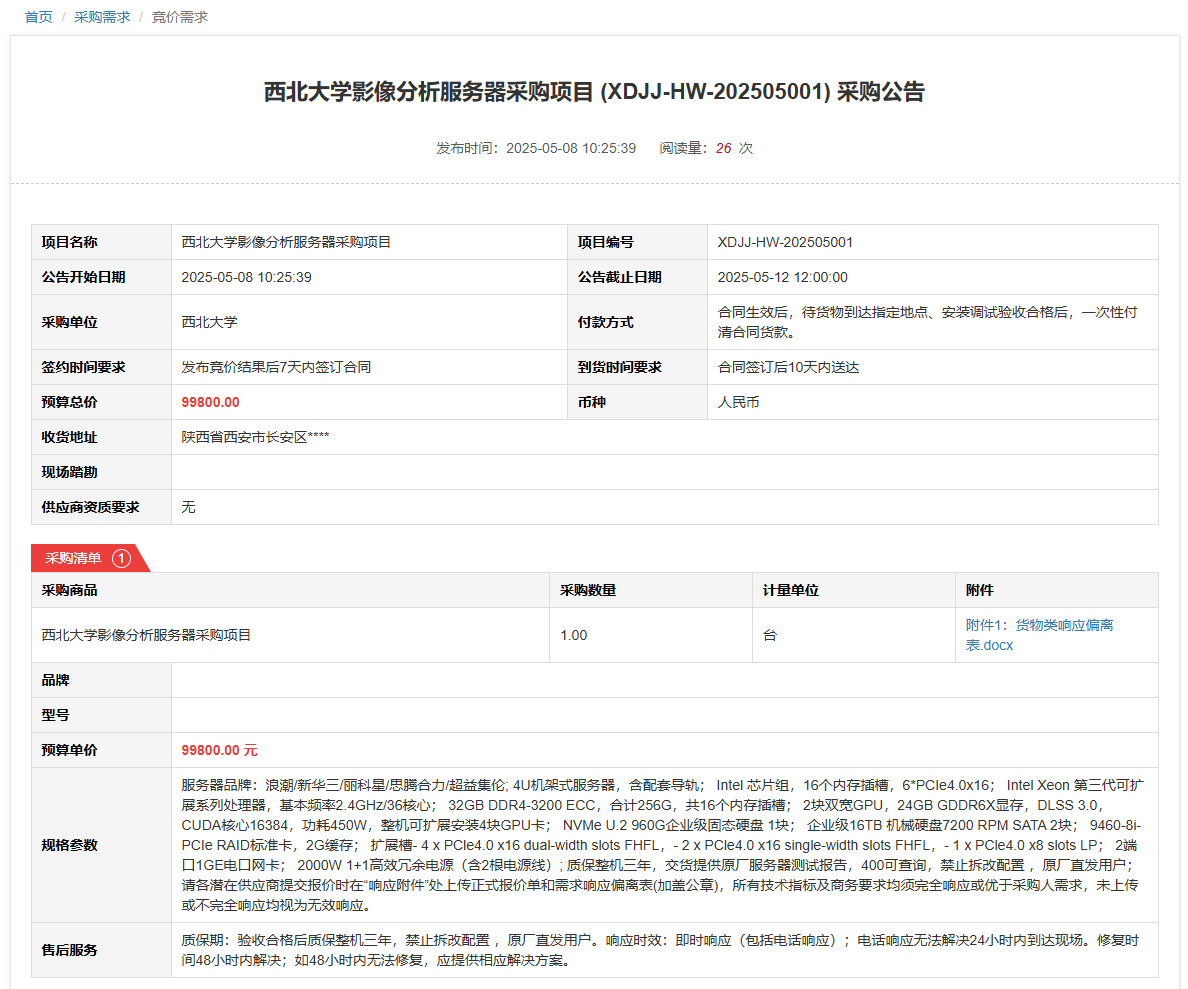 乐投平台影像分析服务器采购项目(XDJJ-HW-202505001)竞价采购公告 作者:采购与招标办公室 编辑: 时间:2025-05-08 原公告链接:https://www.ejingcai.com.cn/site/bidding/detail/18102