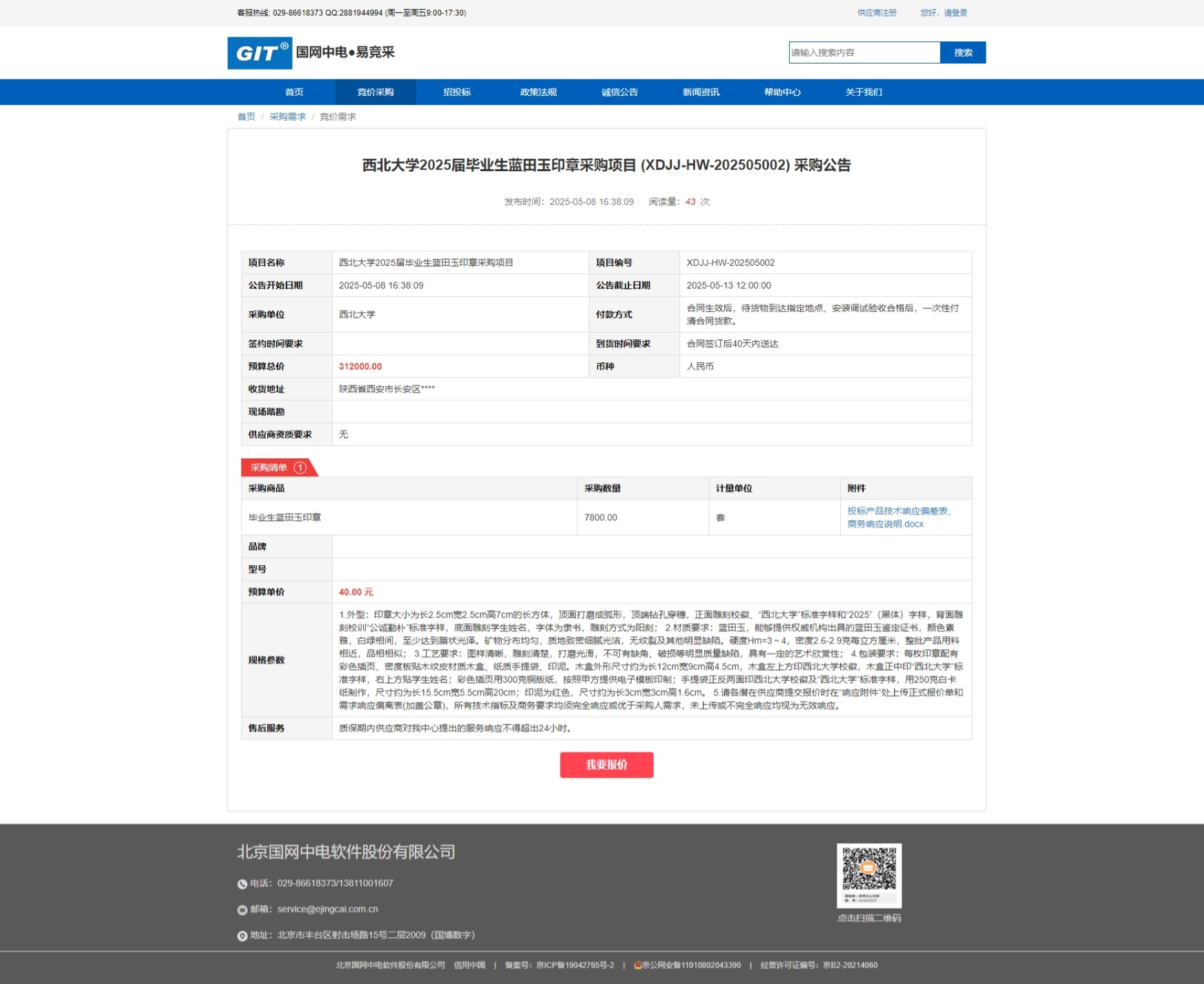 乐投平台2025届毕业生蓝田玉印章采购项目 (XDJJ-HW-202505002) 竞价采购公告 作者: 编辑:采购与招标办公室 时间:2025-05-09 原公告链接:https://www.ejingcai.com.cn/site/bidding/detail/18114