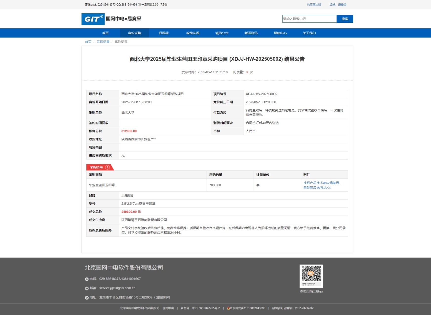 乐投平台2025届毕业生蓝田玉印章采购项目 (XDJJ-HW-202505002) 竞价结果公告 作者: 编辑:采购与招标办公室 时间:2025-05-14 原公告链接:https://www.ejingcai.com.cn/site/bidding/detail/18215
