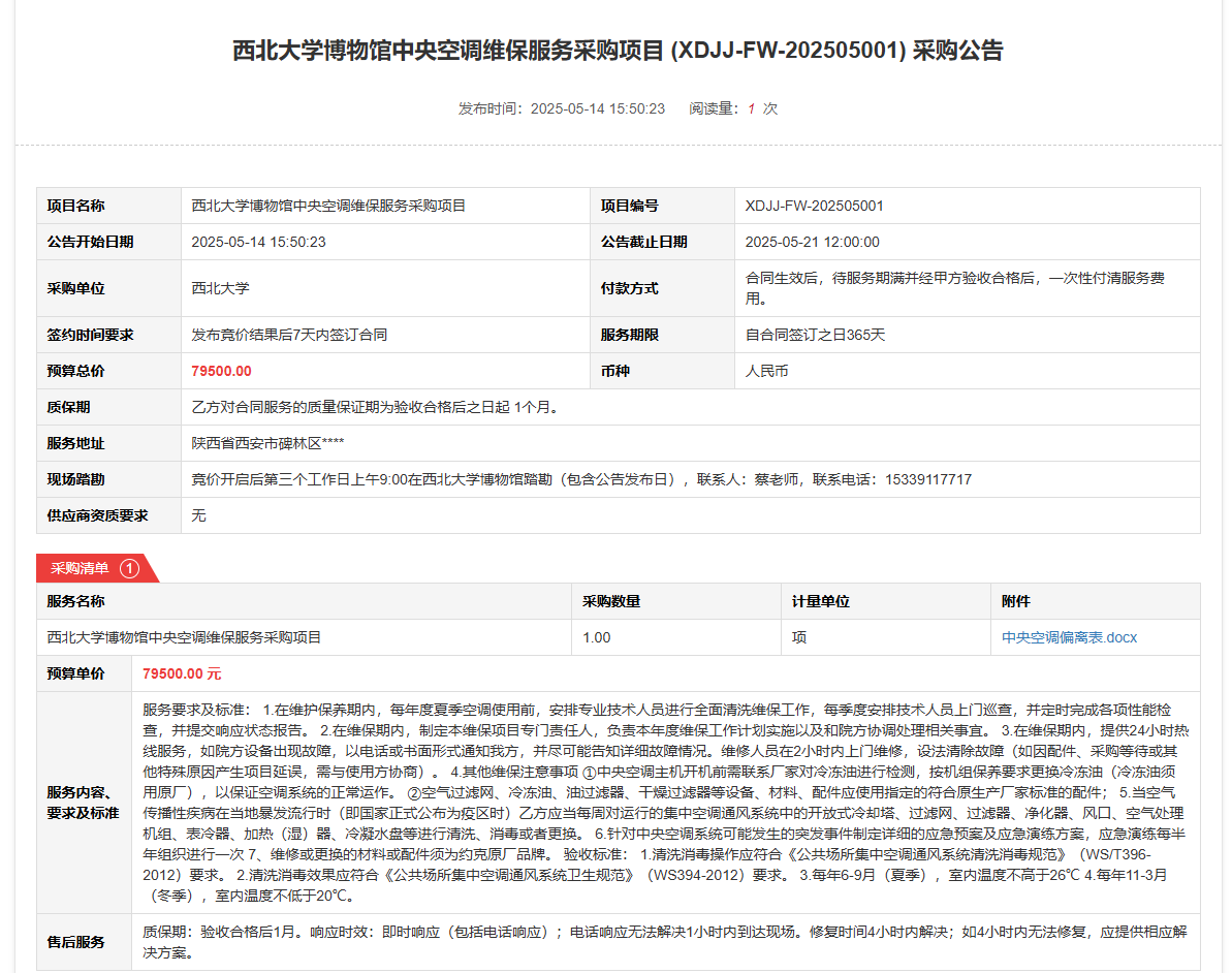 乐投平台博物馆中央空调维保服务采购项目(XDJJ-FW-202505001)竞价采购公告 作者:采购与招标办公室 编辑: 时间:2025-05-14 原公告链接:https://www.ejingcai.com.cn/site/bidding/detail/18217