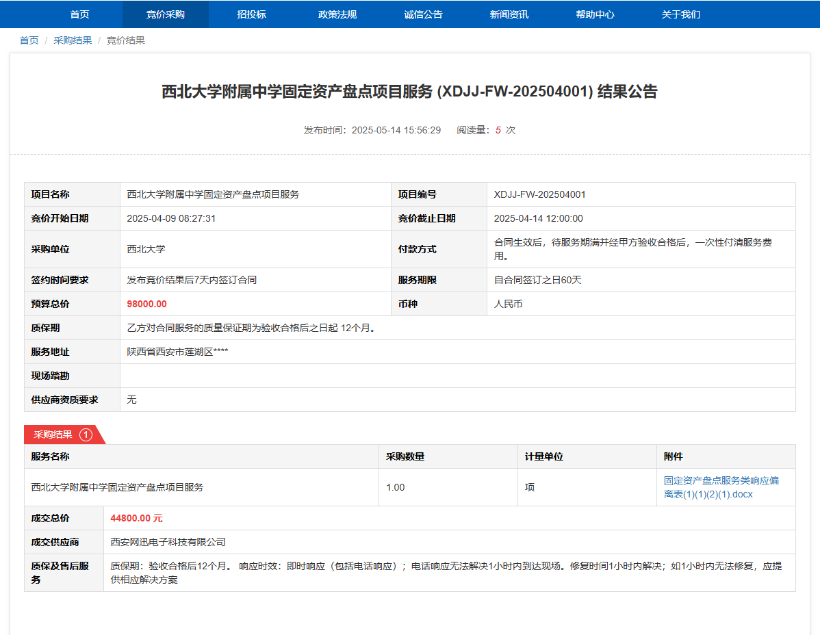 乐投平台附属中学固定资产盘点项目服务(XDJJ-FW-202504001)竞价结果公告 作者:采购与招标办公室 编辑: 时间:2025-05-14 原公告链接:https://www.ejingcai.com.cn/site/bidding/detail/18218