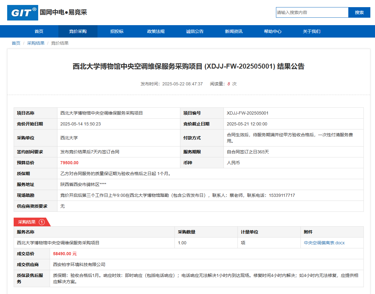 乐投平台博物馆中央空调维保服务采购项目(XDJJ-FW-202505001)竞价结果公告 作者:采购与招标办公室 编辑: 时间:2025-05-22 原公告链接:https://www.ejingcai.com.cn/site/bidding/detail/18384