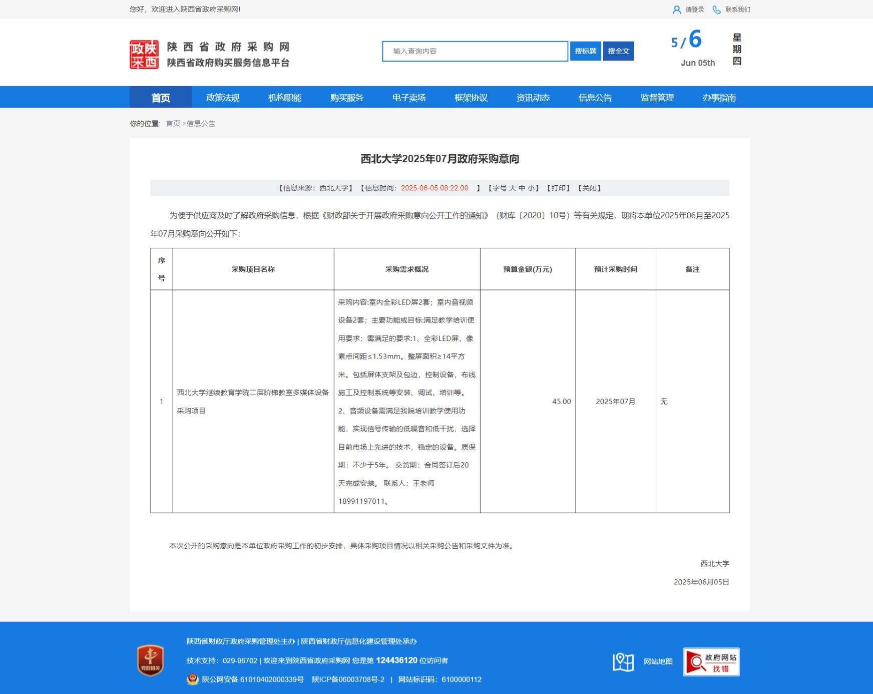乐投平台2025年07月政府采购意向 作者: 编辑:采购与招标办公室 时间:2025-06-05 原公告链接:https://www.ccgp-shaanxi.gov.cn/freecms/site/shaanxi/ggxx/info/2025/8a69c8d196ce440a01973d667fcf58b5.html?noticeType=59¬iceId=0a572344-41a5-11f0-8063-08c0eb20c666
