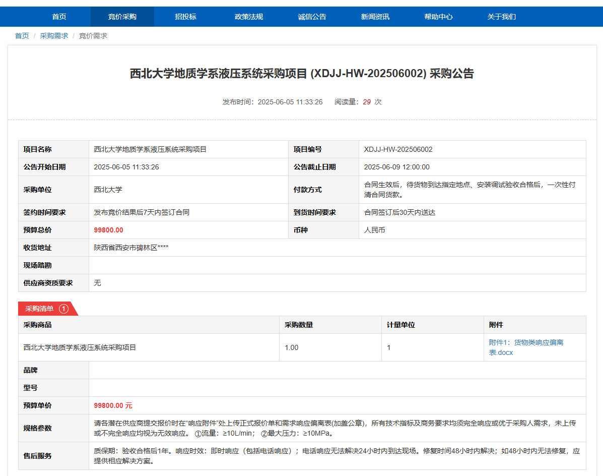 乐投平台地质学系液压系统采购项目(XDJJ-HW-202506002)竞价采购公告 作者: 编辑: 时间:2025-06-05 原公告链接:https://www.ejingcai.com.cn/site/bidding/detail/18680