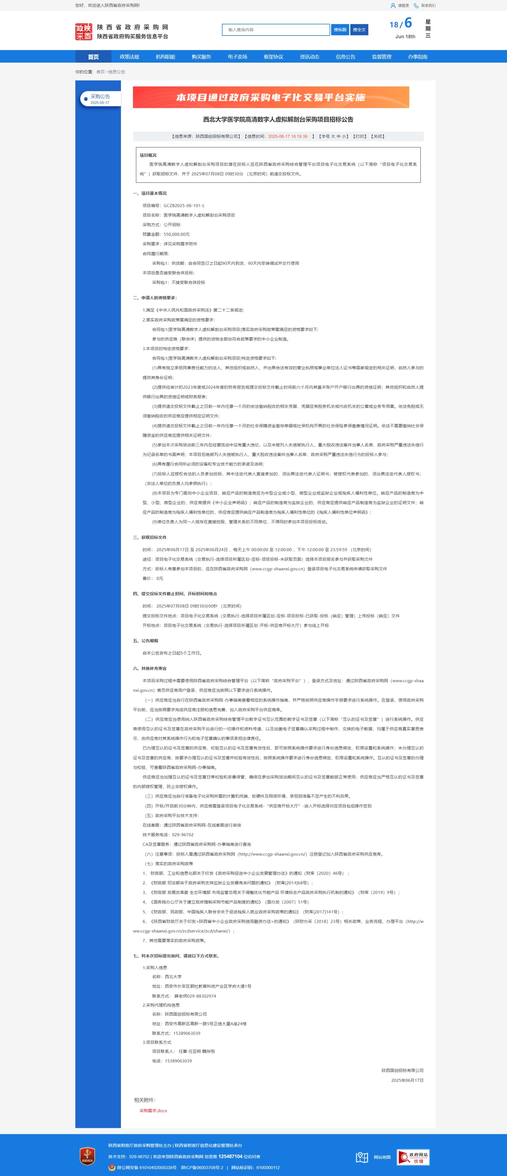 乐投平台医学院高清数字人虚拟解剖台采购项目招标公告 作者: 编辑:采购与招标办公室 时间:2025-06-18 原公告链接:https://www.ccgp-shaanxi.gov.cn/freecms/site/shaanxi/ggxx/info/2025/8a69c0a29672060001977d5b25b77c33.html?noticeType=001011¬iceId=8a96e29e-4b66-11f0-8063-08c0eb20c666