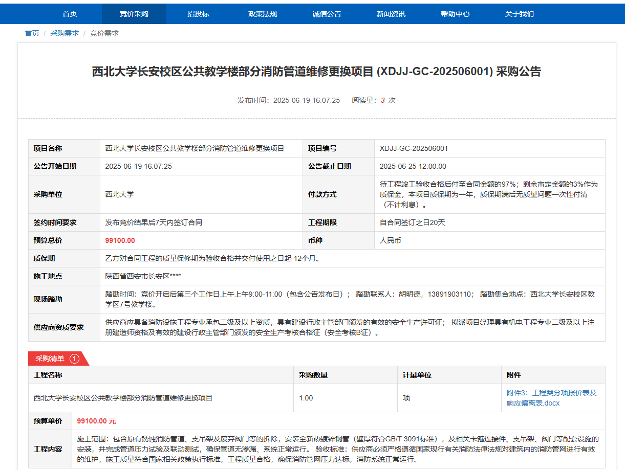 乐投平台长安校区公共教学楼部分消防管道维修更换项目(XDJJ-GC-202506001)竞价采购公告 作者:采购与招标办公室 编辑: 时间:2025-06-19 原公告链接:https://www.ejingcai.com.cn/site/bidding/detail/19038
