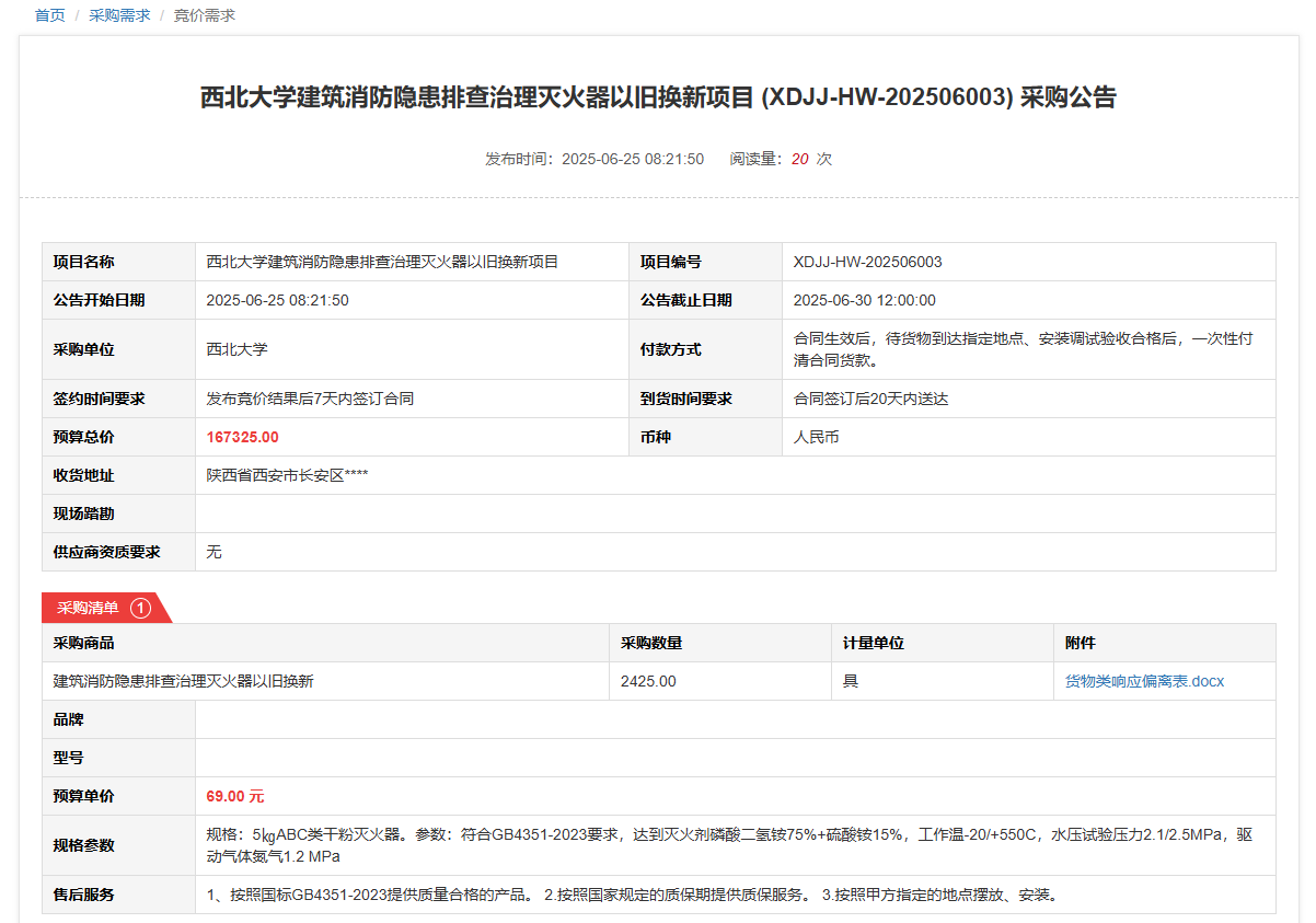 乐投平台建筑消防隐患排查治理灭火器以旧换新项目(XDJJ-HW-202506003)竞价采购公告 作者:采购与招标办公室 编辑: 时间:2025-06-25 原公告链接:https://www.ejingcai.com.cn/site/bidding/detail/19167