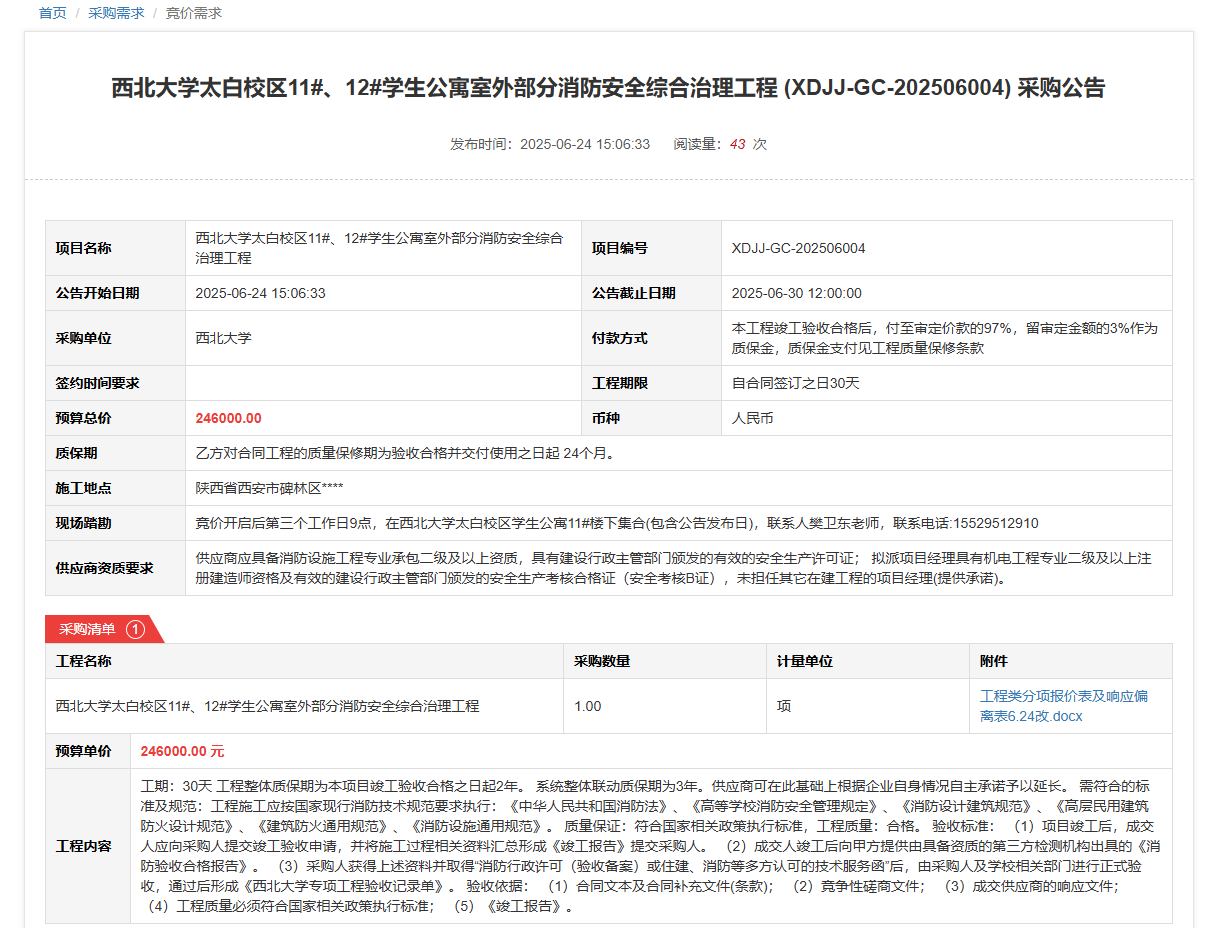 乐投平台太白校区11#、12#学生公寓室外部分消防安全综合治理工程(XDJJ-GC-202506004)竞价采购公告 作者:采购与招标办公室 编辑: 时间:2025-06-25 原公告链接:https://www.ejingcai.com.cn/site/bidding/detail/19136