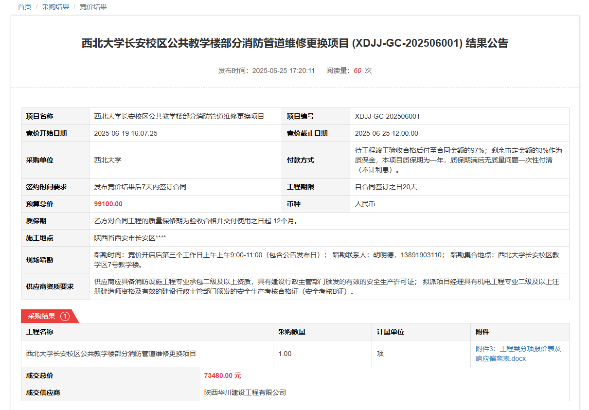 乐投平台长安校区公共教学楼部分消防管道维修更换项目(XDJJ-GC-202506001)竞价结果公告 作者:采购与招标办公室 编辑: 时间:2025-06-25 原公告链接:https://www.ejingcai.com.cn/site/bidding/detail/19191