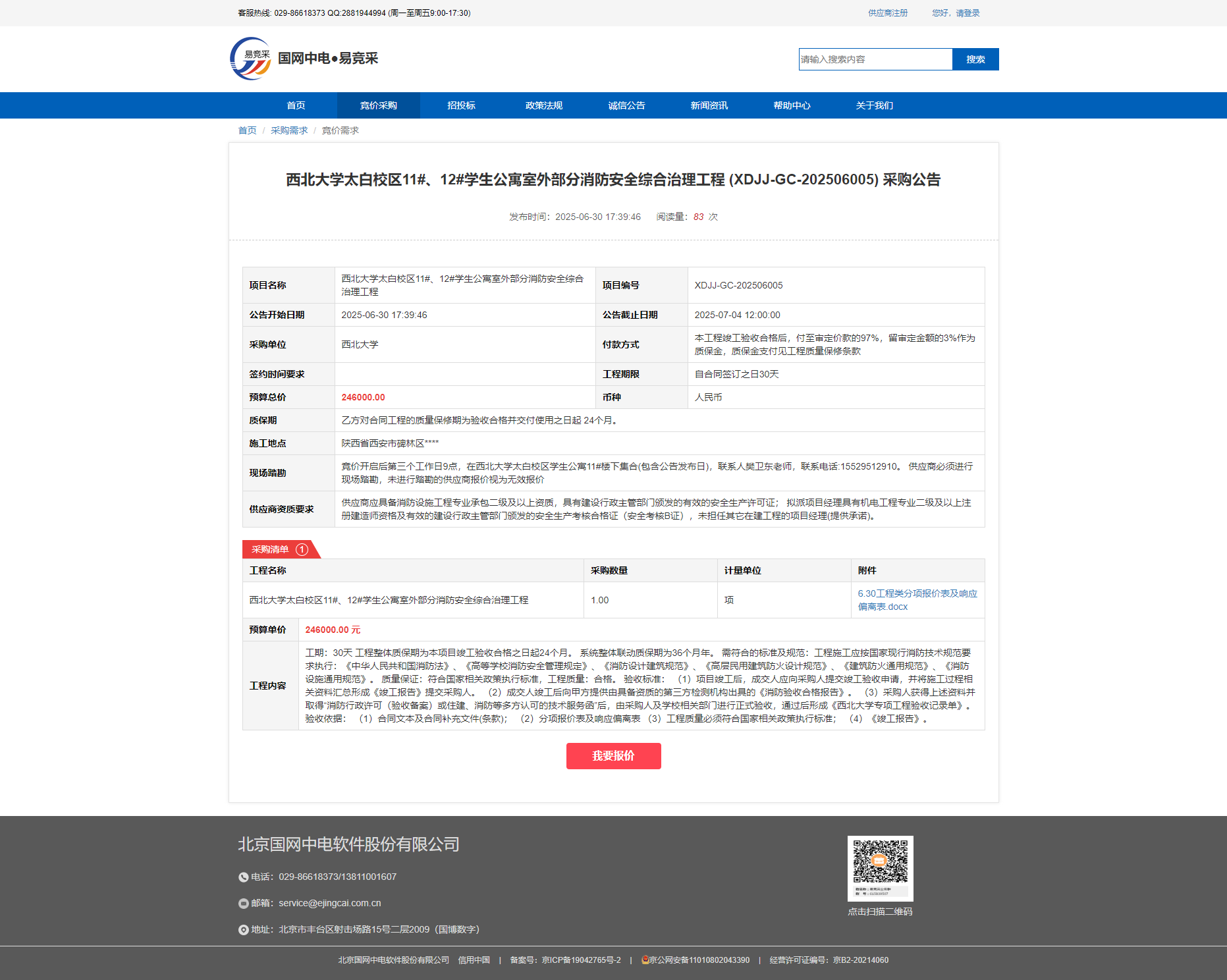 乐投平台太白校区11#、12#学生公寓室外部分消防安全综合治理工程 (XDJJ-GC-202506005) 采购公告