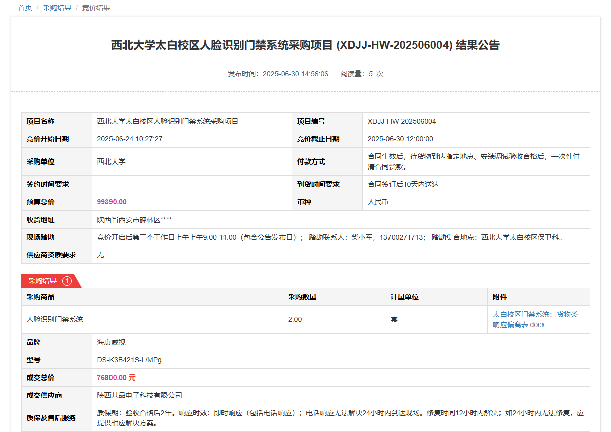 乐投平台太白校区人脸识别门禁系统采购项目(XDJJ-HW-202506004)竞价结果公告 作者:采购与招标办公室 编辑: 时间:2025-06-30 原公告链接:https://www.ejingcai.com.cn/site/bidding/detail/19250