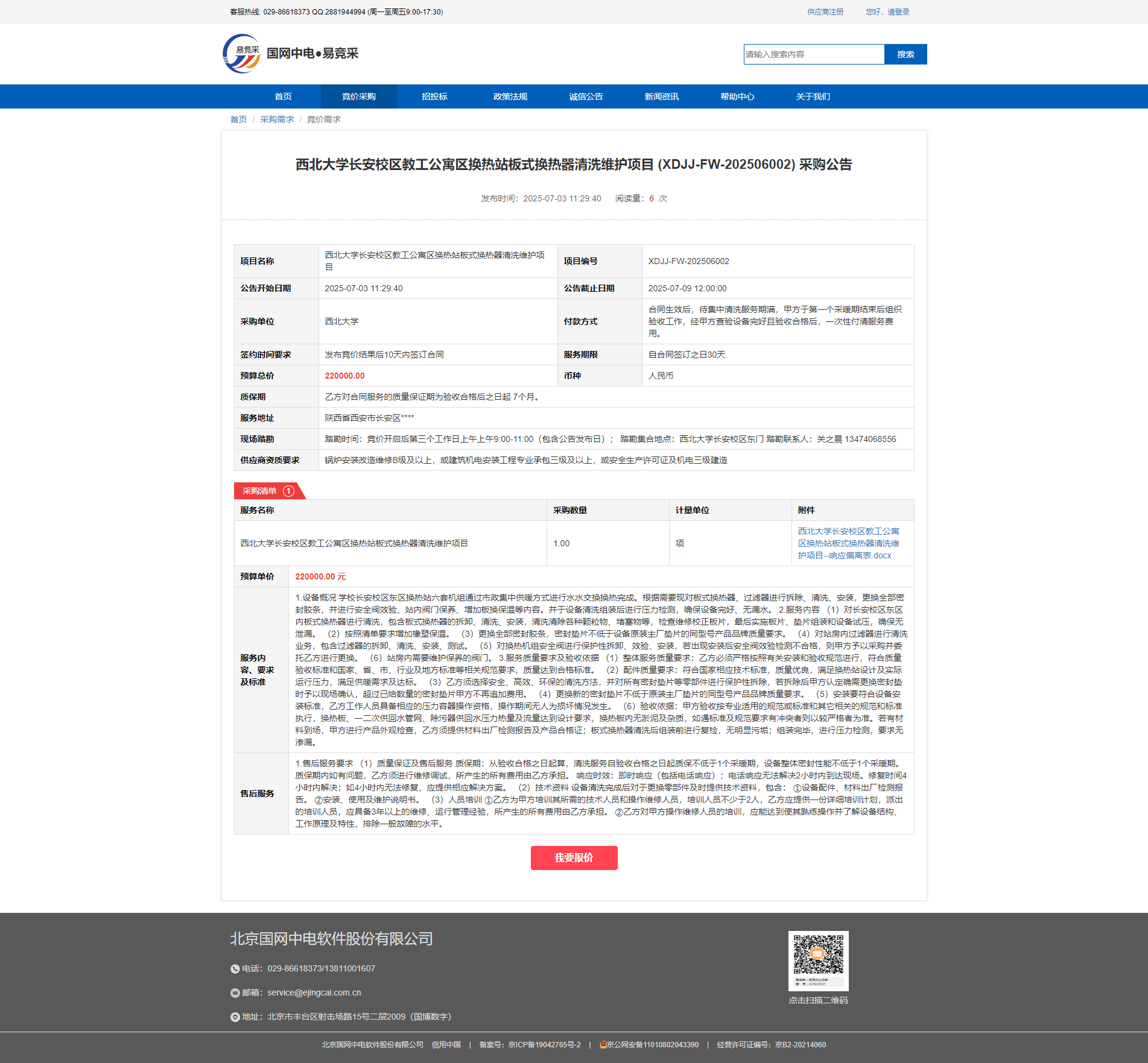 乐投平台长安校区教工公寓区换热站板式换热器清洗维护项目 (XDJJ-FW-202506002) 采购公告