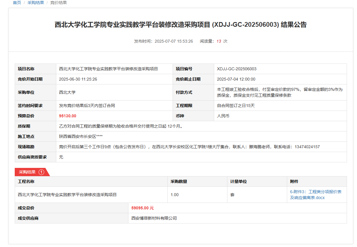 乐投平台化工学院专业实践教学平台装修改造采购项目(XDJJ-GC-202506003)竞价结果公告