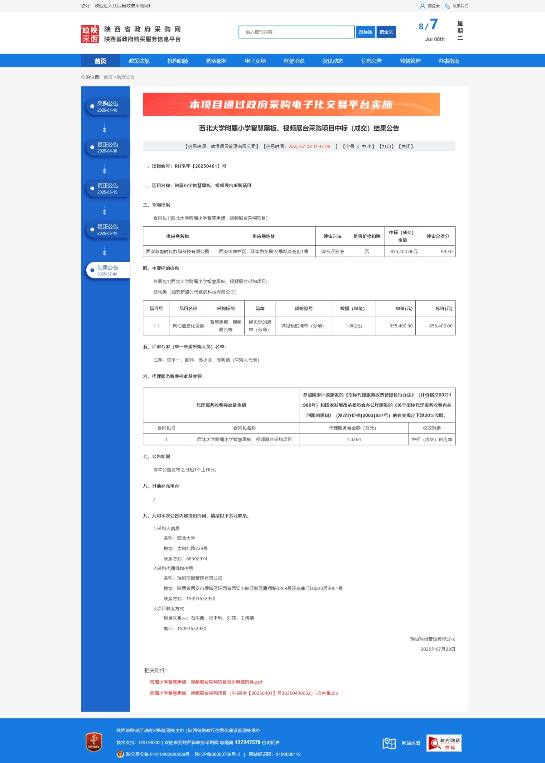 乐投平台附属小学智慧黑板、视频展台采购项目中标(成交)结果公告 作者: 编辑:采购与招标办公室 时间:2025-07-08 原公告链接:https://www.ccgp-shaanxi.gov.cn/freecms/site/shaanxi/ggxx/info/2025/8a69c0bc97db81390197e819c3dd4789.html?noticeType=001021¬iceId=37da8661-5bb0-11f0-8063-08c0eb20c666