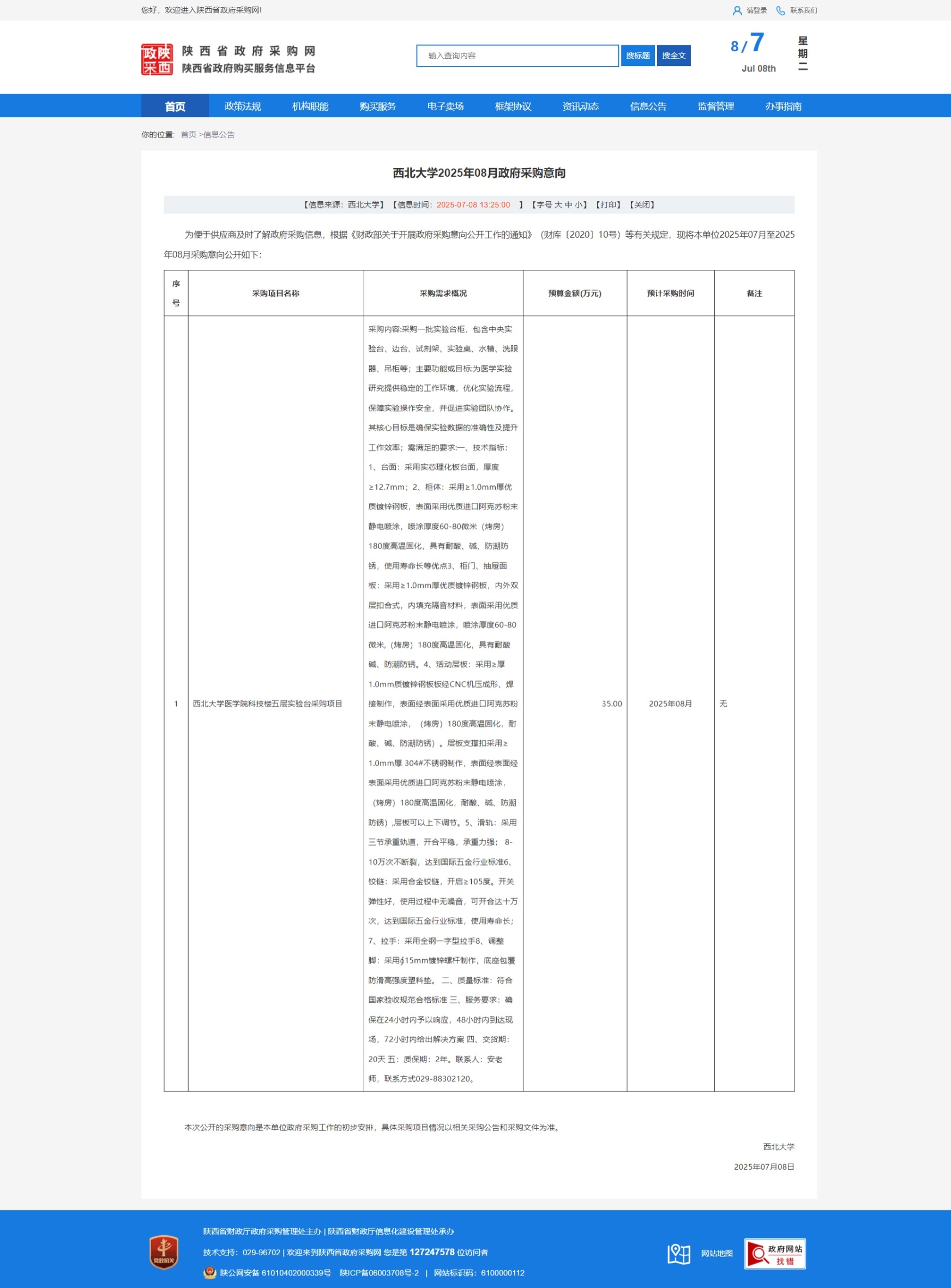 乐投平台2025年08月政府采购意向 作者: 编辑:采购与招标办公室 时间:2025-07-08 原公告链接:https://www.ccgp-shaanxi.gov.cn/freecms/site/shaanxi/ggxx/info/2025/8a69c68d97d2c4550197e87d6842455f.html?noticeType=59¬iceId=e4cb9cdd-5bbd-11f0-8063-08c0eb20c666