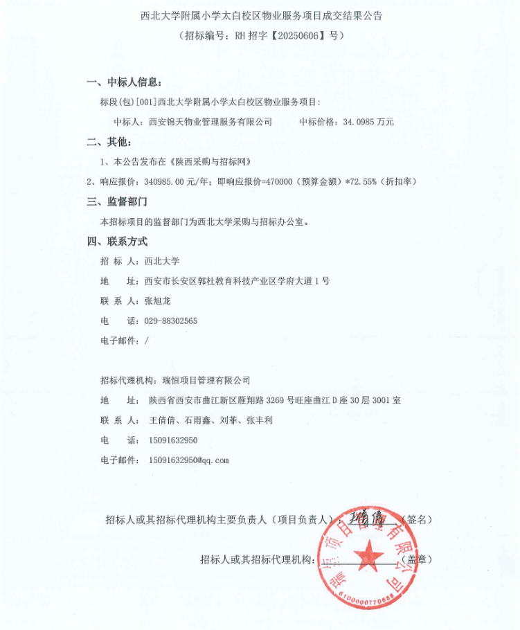 乐投平台附属小学太白校区物业服务项目成交结果公告