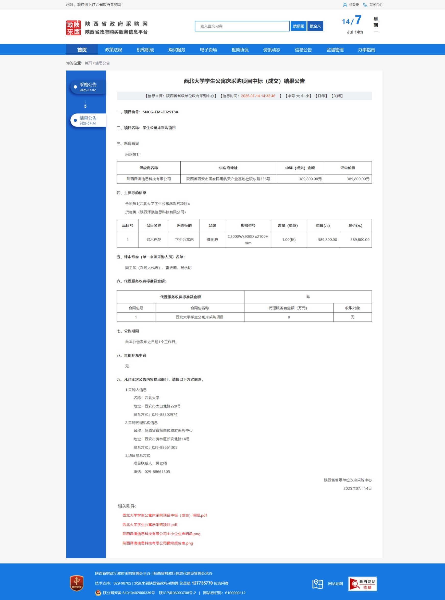 乐投平台学生公寓床采购项目中标(成交)结果公告 作者: 编辑:采购与招标办公室 时间:2025-07-14 原公告链接:https://www.ccgp-shaanxi.gov.cn/freecms/site/shaanxi/ggxx/info/2025/8a69c1d397de6c600198068c5fee4d43.html?noticeType=001023¬iceId=5dd2ddc8-607e-11f0-8063-08c0eb20c666