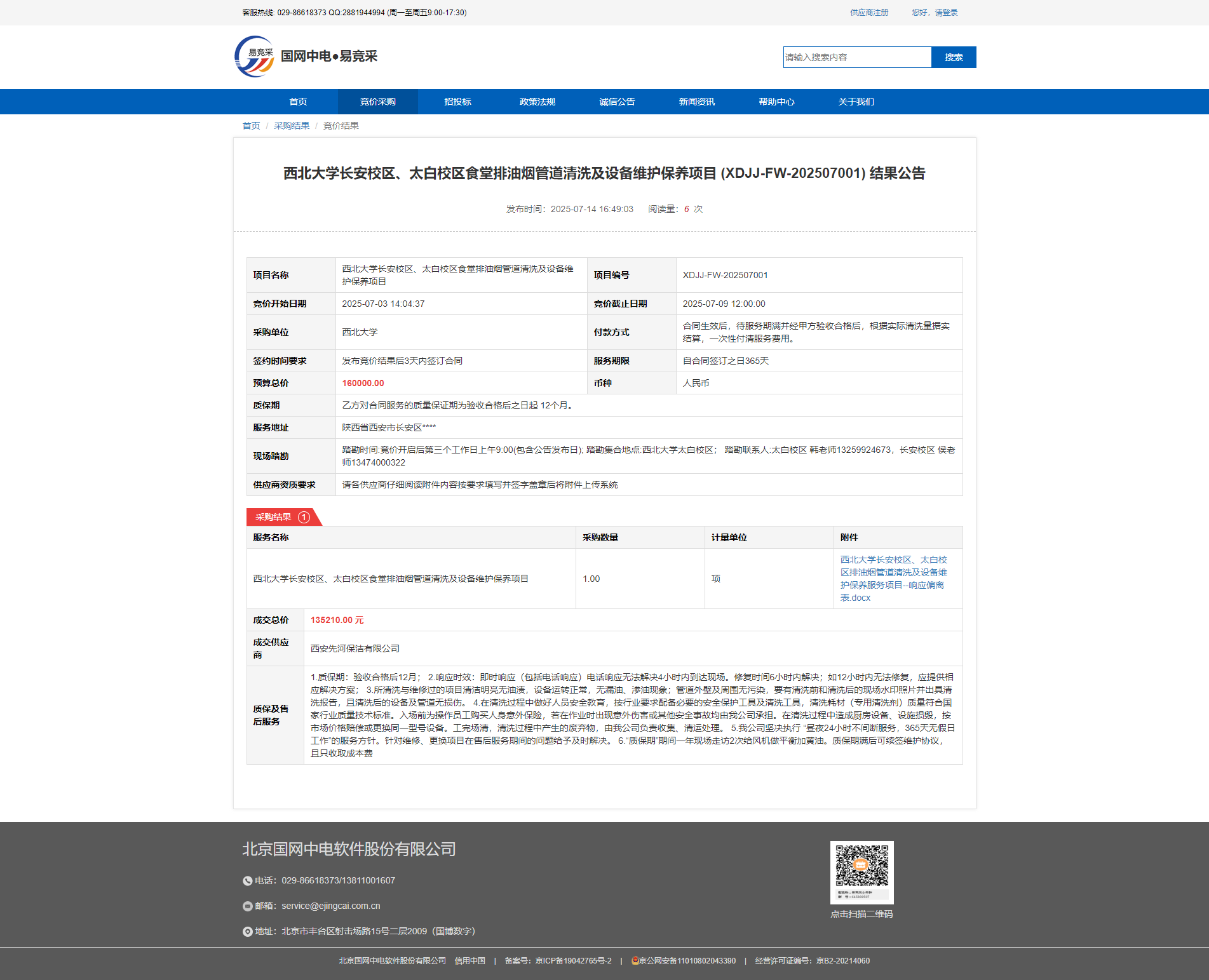 乐投平台长安校区、太白校区食堂排油烟管道清洗及设备维护保养项目 (XDJJ-FW-202507001) 结果公告