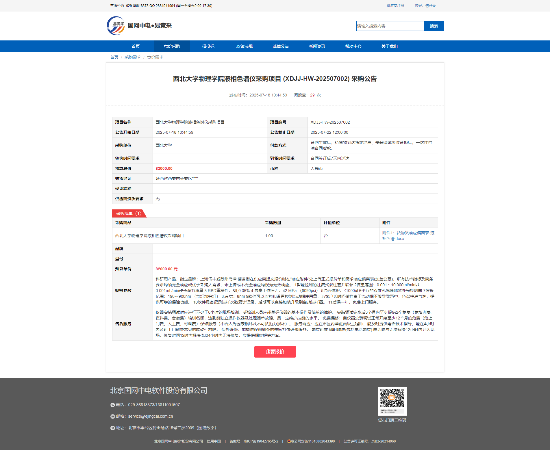 乐投平台物理学院液相色谱仪采购项目 (XDJJ-HW-202507002) 采购公告