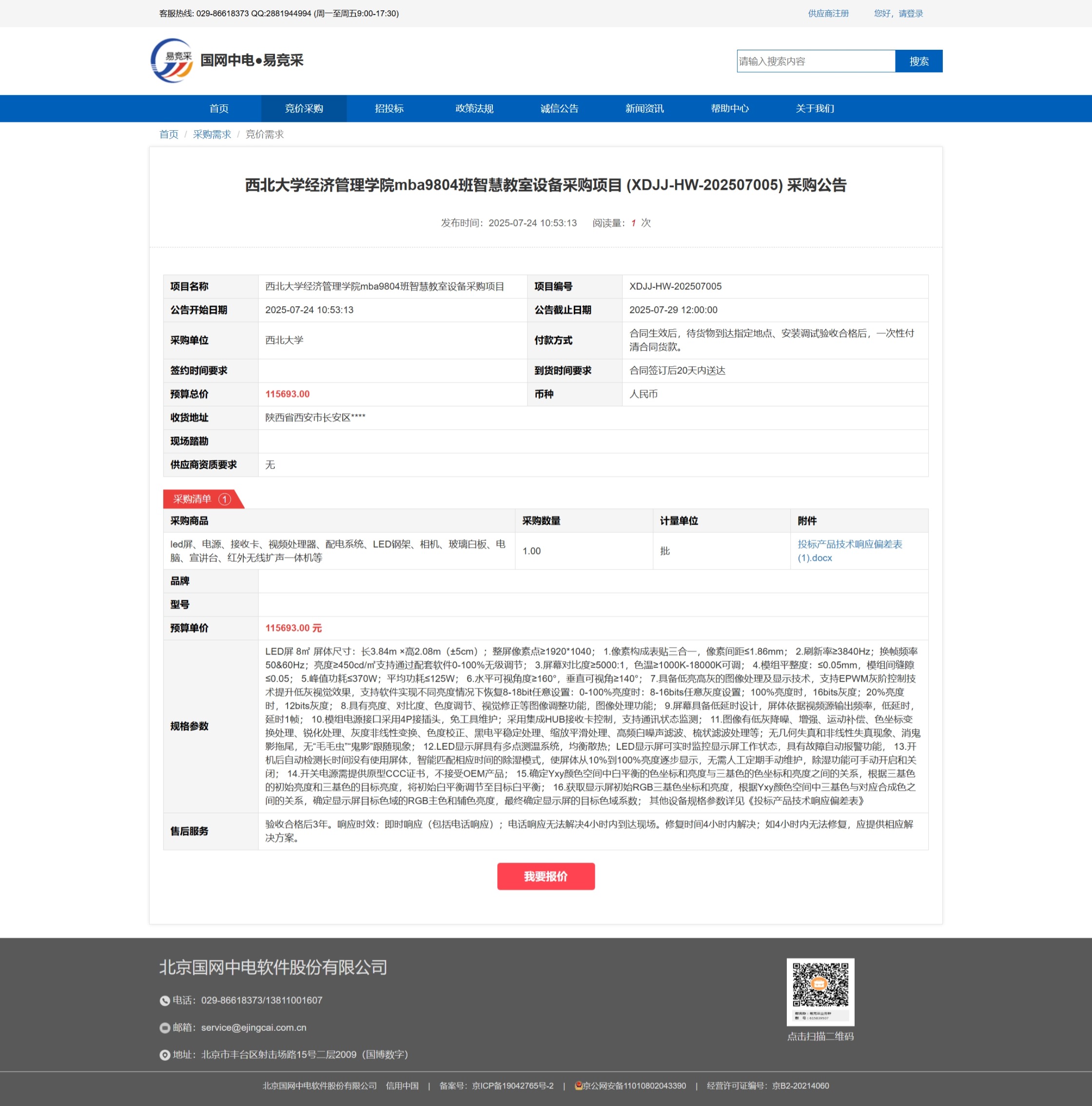 乐投平台经济管理学院mba9804班智慧教室设备采购项目 (XDJJ-HW-202507005)竞价采购公告 作者: 编辑:薛利娟 时间:2025-07-24 原公告链接:https://www.ejingcai.com.cn/site/bidding/detail/19708
