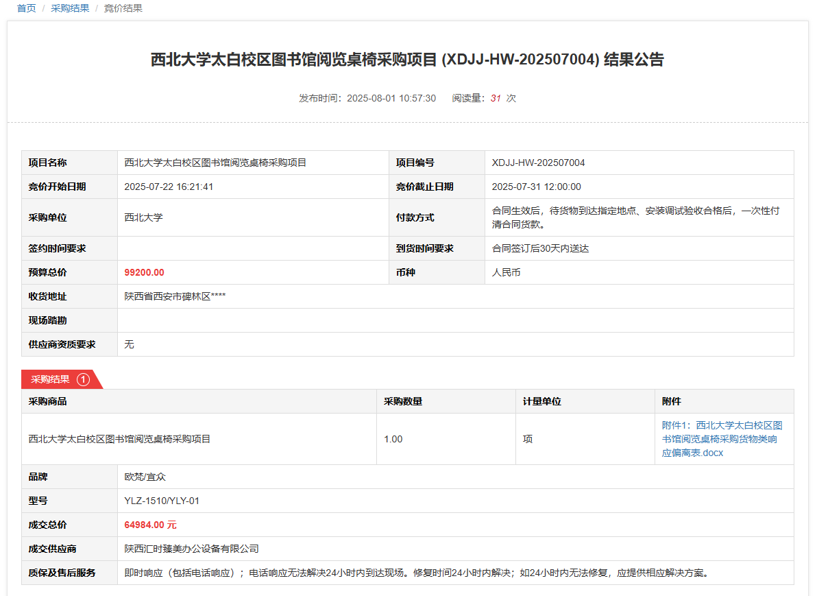 乐投平台太白校区图书馆阅览桌椅采购项目(XDJJ-HW-202507004)竞价结果公告