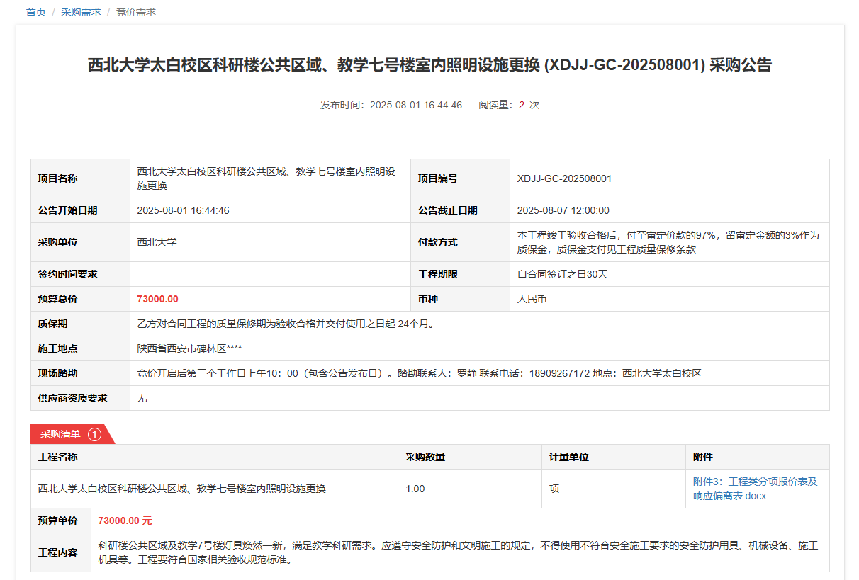 乐投平台太白校区科研楼公共区域、教学七号楼室内照明设施更换(XDJJ-GC-202508001)竞价采购公告