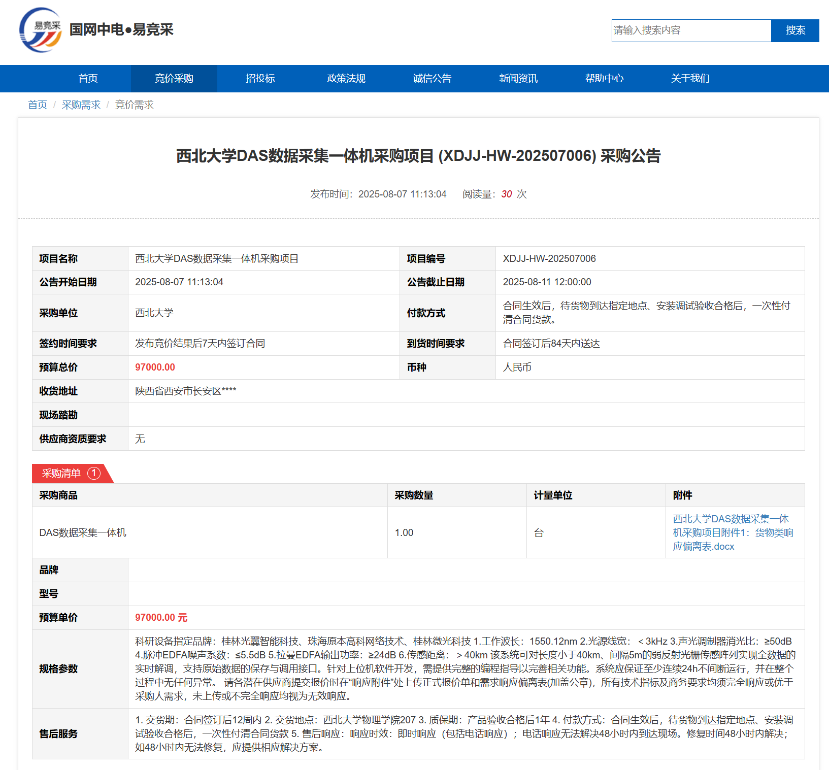 乐投平台DAS数据采集一体机采购项目(XDJJ-HW-202507006)竞价采购公告