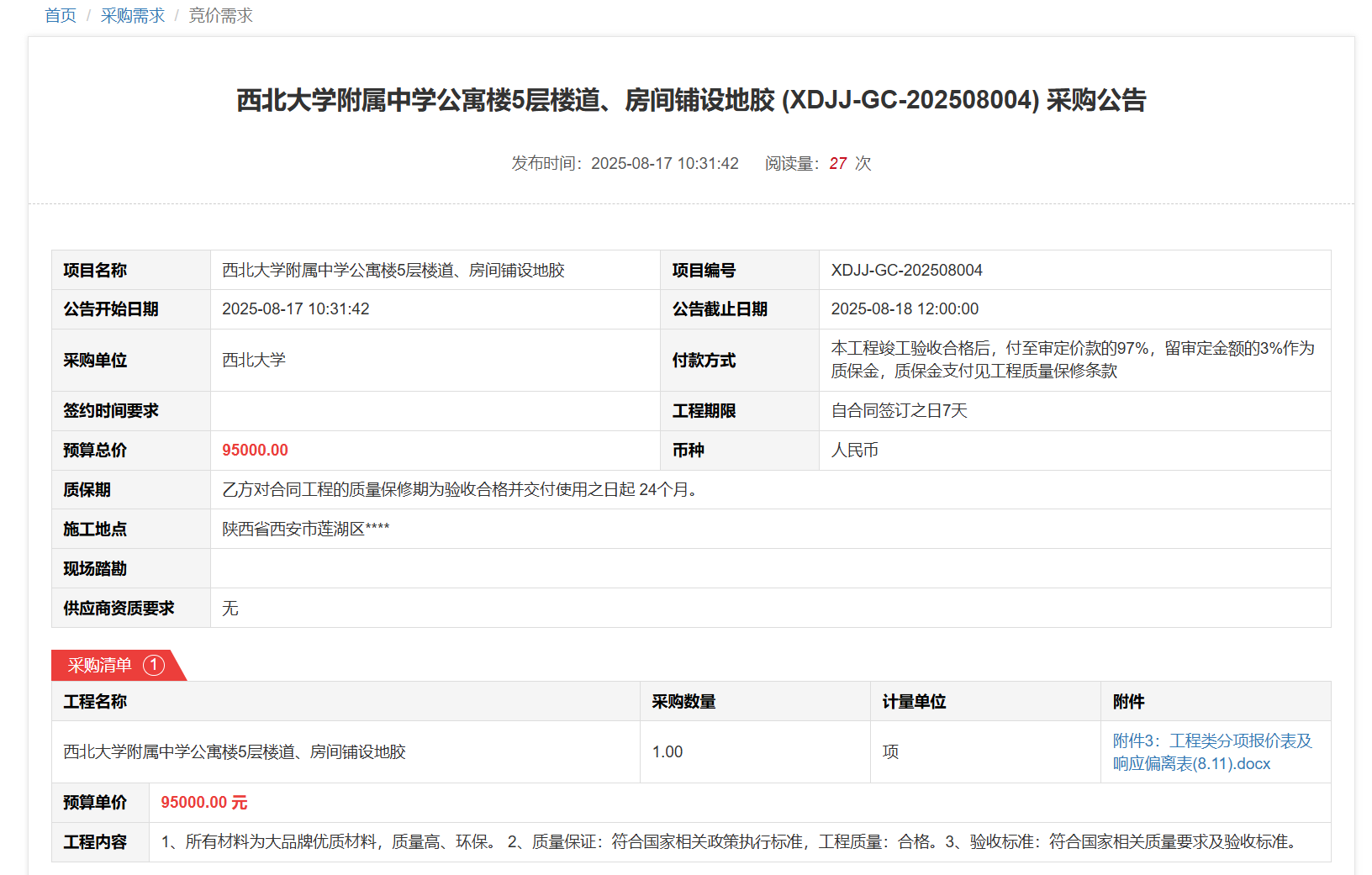 乐投平台附属中学公寓楼5层楼道、房间铺设地胶(XDJJ-GC-202508004)竞价采购公告