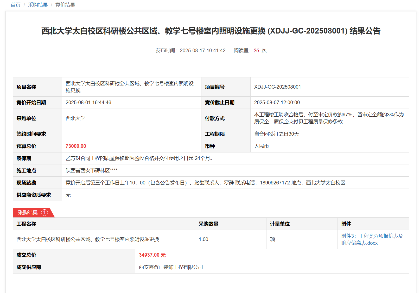 乐投平台太白校区科研楼公共区域、教学七号楼室内照明设施更换(XDJJ-GC-202508001)竞价结果公告