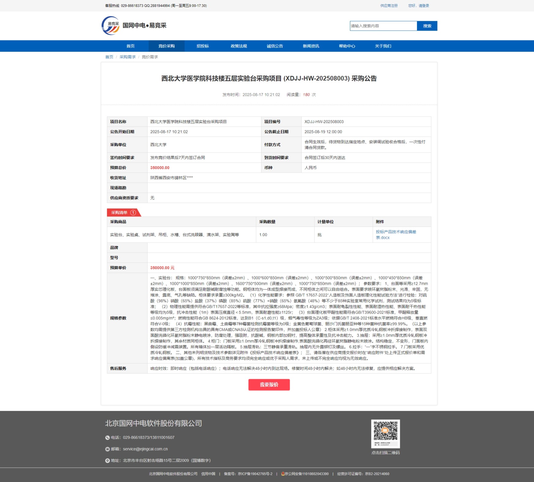 乐投平台医学院科技楼五层实验台采购项目 (XDJJ-HW-202508003)竞价 采购公告 作者: 编辑:采购与招标办公室 时间:2025-08-18 原公告链接:https://www.ejingcai.com.cn/site/bidding/detail/19996