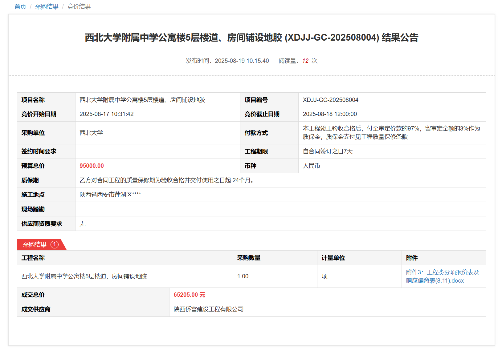 乐投平台附属中学公寓楼5层楼道、房间铺设地胶(XDJJ-GC-202508004)竞价结果公告