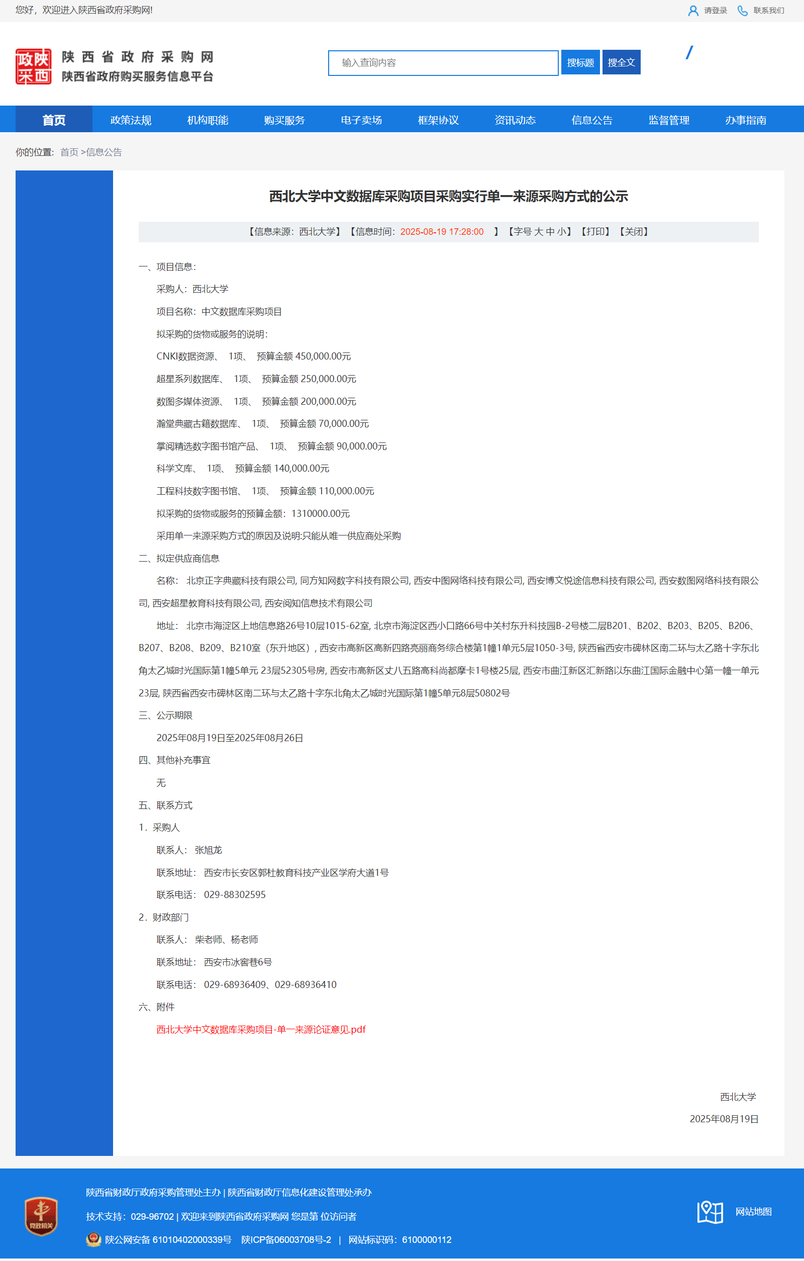 乐投平台中文数据库采购项目采购实行单一来源采购方式的公示