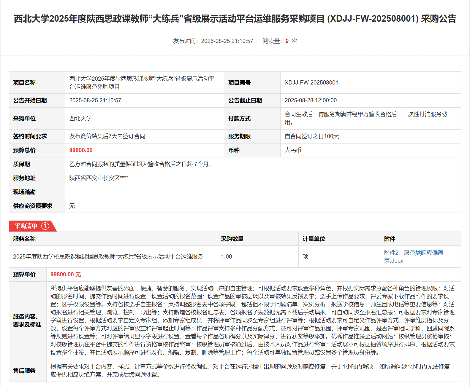 乐投平台2025年度陕西思政课教师“大练兵”省级展示活动平台运维服务采购项目(XDJJ-FW-202508001)竞价采购公告