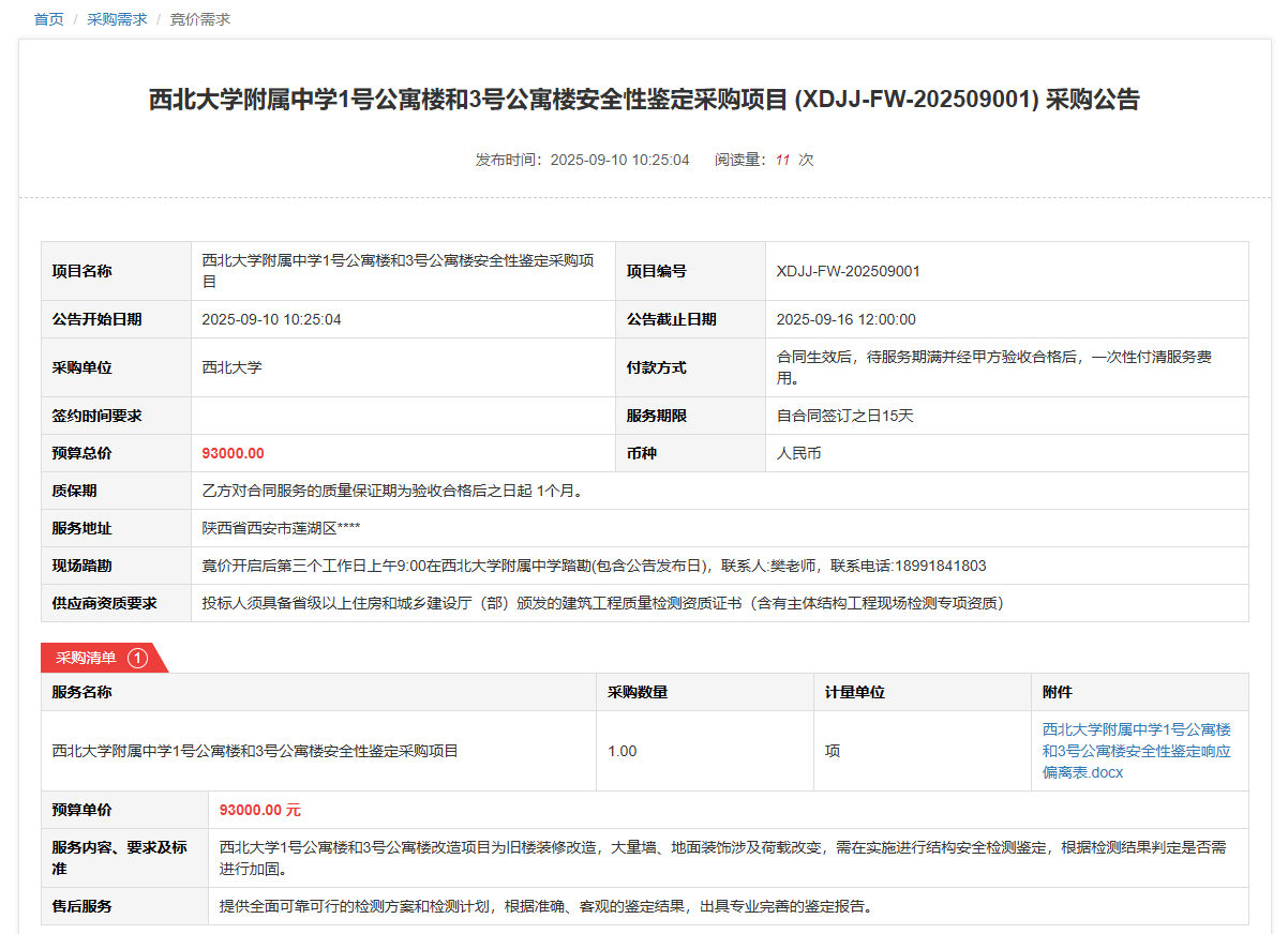 乐投平台附属中学1号公寓楼和3号公寓楼安全性鉴定采购项目(XDJJ-FW-202509001)竞价采购公告