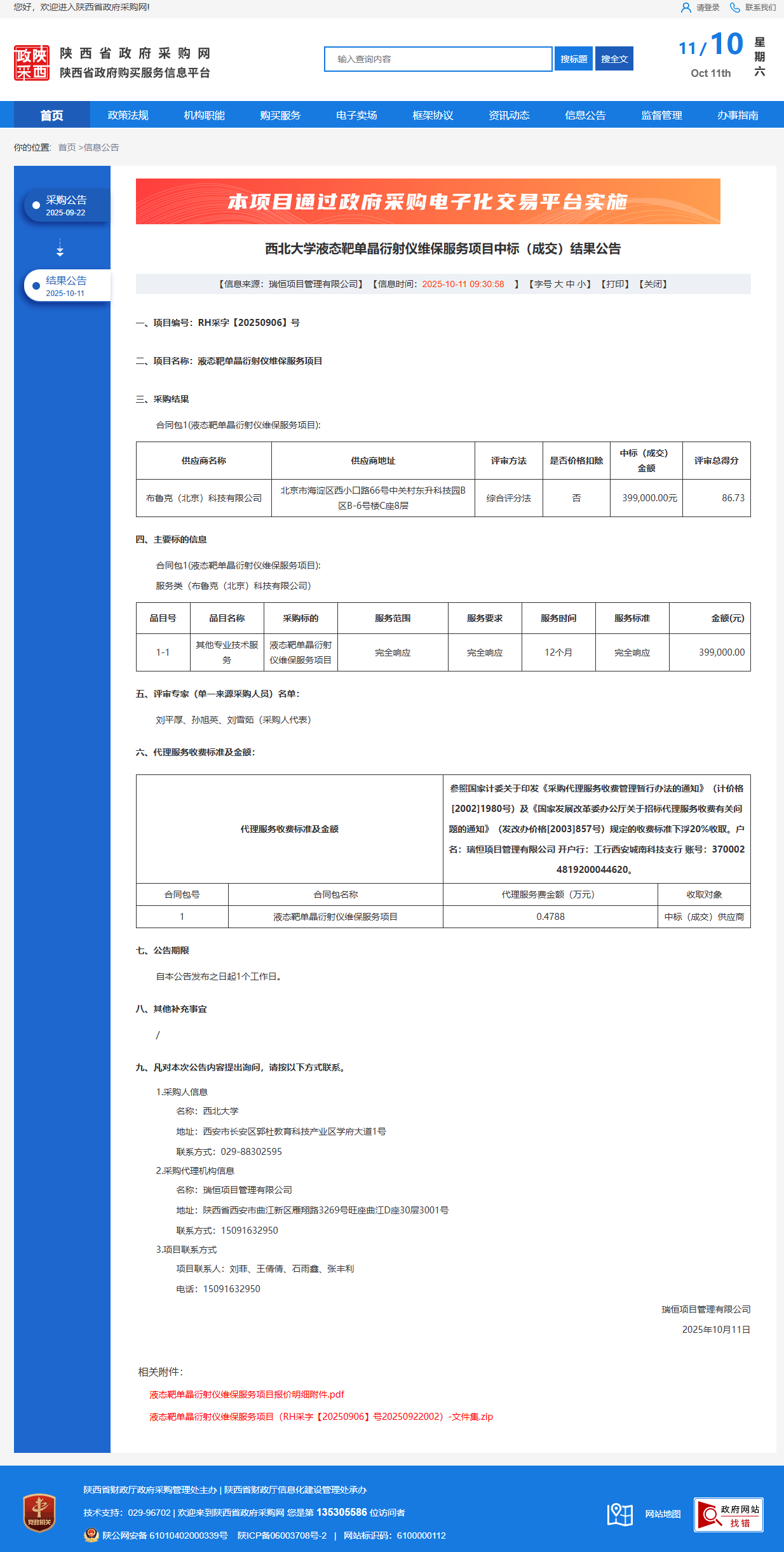 乐投平台液态靶单晶衍射仪维保服务项目中标(成交)结果公告