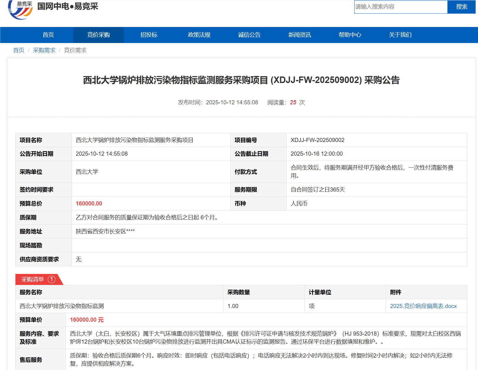 乐投平台锅炉排放污染物指标监测服务采购项目(XDJJ-FW-202509002)竞价采购公告